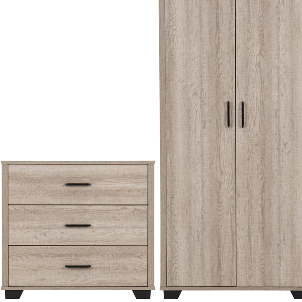 Create a supremely stylish bedroom with the Oliver bedroom set in a light oak effect. This collection comprises a generously sized two-door wardrobe, a three-drawer chest, and a coordinating three-drawer bedside table - all designed to inject contemporary flair into your space.