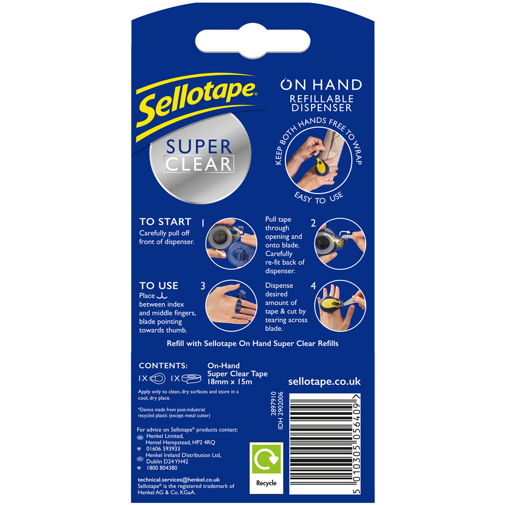 Give a handy addition to your stationery or DIY box Sellotape On Hand Dispenser. Complete with 18mm x 15m super clear tape, it's ideal for a variety of projects and craft activities whether you are wrapping presents, scrapbooking or fixing items around your home. The tape is strong and super sticky, and once this runs out - simply refill the dispenser. Easy and quick to use, it gives you a hands-free experience to tackle any craft or DIY task.
