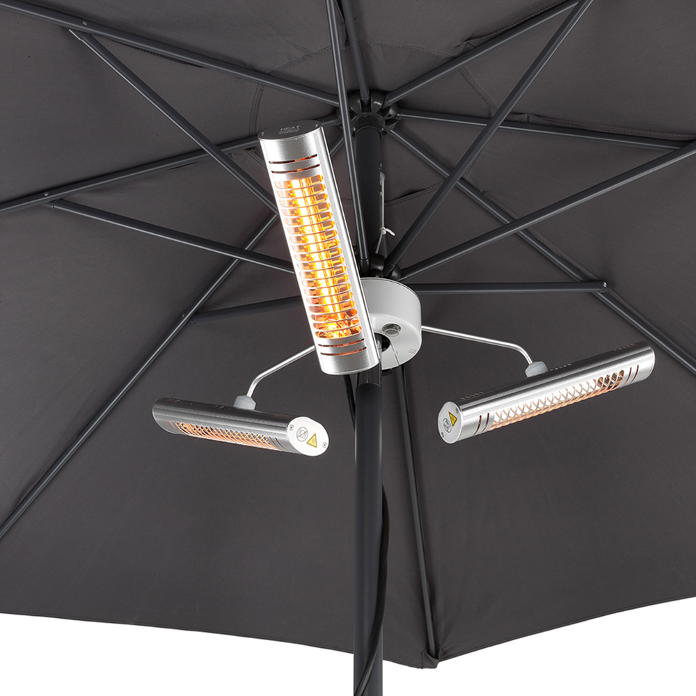 Enhance your outdoor space with the Shadow Patio Heater, a stylish and robust solution for comfortable warmth. Its subtly radiant heat creates a welcoming ambience without harsh glare. Boasting an IP65 rating, this heater confidently handles any weather. Perfect for areas up to 9m², its 3kW power delivers effective heating. A remote control version is also available for added convenience. Installation is straightforward with the included L-shaped mounting bracket and fixings, chains for hanging, and wall-mounting brackets. The long-life infrared lamps provide 5,000-7,000 hours of use. The 3kW model features a 1.8m cable and UK plug. A parabolic reflector maximises efficiency. The silver anodised aluminium body is both durable and elegant. For safe operation, ensure adequate ventilation: minimum 0.4m clearance from ceilings/roofs (0.5m when mounted directly downwards), 0.5m from walls/fabrics, 1.8m from the floor, and 1m from flammable materials. For continuous commercial use, consult an electrician; prolonged use may require hard-wiring to a 20A fused spur.