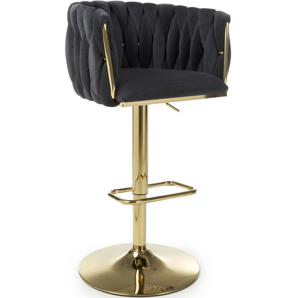 Introduce an air of sophistication to your home with the Shankar Bellaire Black Brushed Velvet Bar Stool. This stool features beautifully woven, tactile upholstery, threaded around a semi-circular, gold-finished backrest frame for ultimate elegance. Comfort is ensured with supported armrests and a padded seat, completing the decadent aesthetic. Adjust the stool height from 85cm to 107cm using the under-seat gas lift mechanism, and enjoy the full 360-degree swivel capability of the seat. The stool sits atop a stunning gold base, adding a touch of glamour. This item requires assembly and is sold individually.