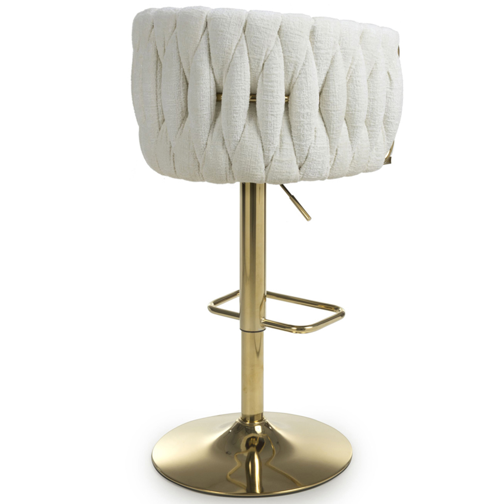 Introduce a touch of elegance to your home with the Bellaire Cream Textured Bar Stool, a stunning piece that blends comfort and style seamlessly. This stool features beautifully woven, tactile upholstery that is threaded around a semi-circular gold backrest frame, creating a truly decadent aesthetic. Comfortable, supported armrests and a padded seat enhance the luxurious feel, ensuring maximum comfort.