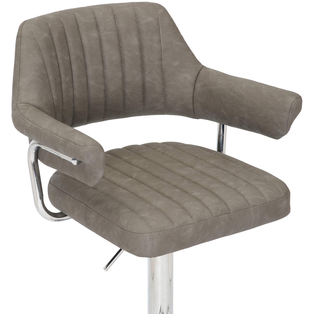 Introduce a touch of class to your home with the Shankar Cortez Charcoal Leather Bar Stool set. Sold in pairs, these striking contemporary bar stools are upholstered in a leather effect fabric, featuring a floating seat design. The backrest is accented with stylish ribbed stitch detailing. For added comfort, the layered back and armrests are supported by a distinctive L-shaped curved chrome bar. The rounded chrome base includes a large rectangular footrest. Enjoy adjustable height between 93cm and 113cm thanks to the gas lift mechanism, coupled with a full 360-degree swivel seat. Assembly required.