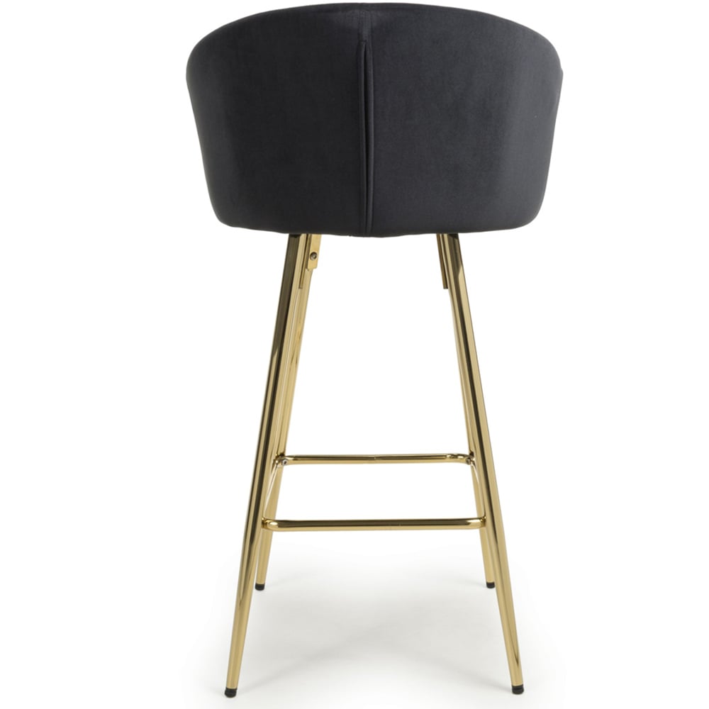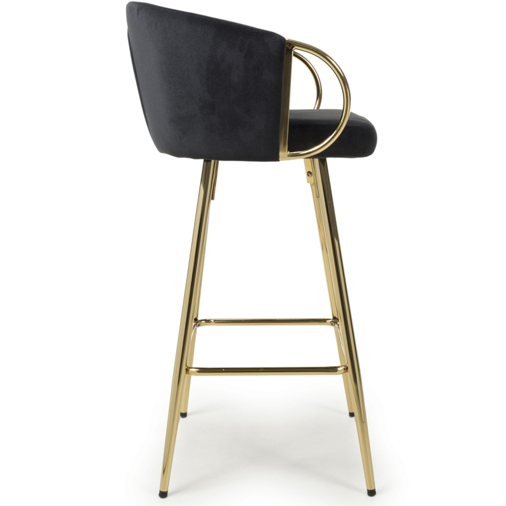 Introduce a touch of class to your home with the Shankar Volero Black Brushed Velvet Bar Stool. This stool gives off a lavish vibe thanks to its gold-framed design, which oozes quality. The snug comfortable seat is upholstered in a tactile textured fabric. The circular backrest is finished with D-shaped gold handles that double as armrests and grips for entering and exiting the stool. An opulent tubular gold-covered chrome frame supports the stool and is secured by a handy square footrest. This product requires assembly and is sold individually.