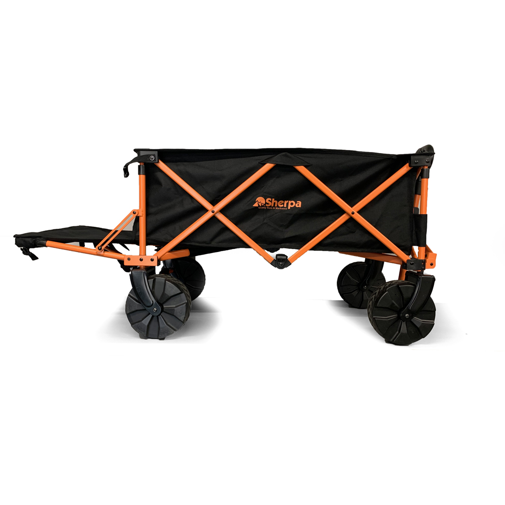 Effortlessly transport your gear with the Sherpa SFC5 Folding Cart. Its wide, rubber-gripped wheels conquer any terrain, while the innovative Sherpa Easy Folding System ensures compact storage and includes a cover for when folded. A durable nylon canvas liner withstands heavy use, and the quiet, caster front wheels with smooth-rolling bearings (on both front and rear wheels) make manoeuvring a breeze. The telescopic handle locks securely in place for comfortable use and conveniently clicks away for storage, release with one button. Extend its carrying capacity by folding down the tailgate for longer or larger items. Ideal for camping and festivals, this cart includes a convenient storage bag with a handle access hole, allowing for easy towing even when folded and covered. Folded dimensions: 39 x 26 x 75cm. Open (cart): 97 x 53 x 64cm. Open (flatbed): 132 x 53 x 64cm.
