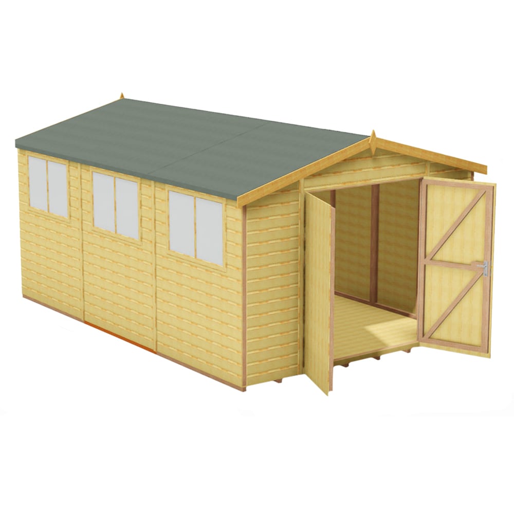 This Shire 10 x 15ft Shiplap Apex Wooden Shed is a handcrafted workshop built for durability. The robust 44mm square framing provides exceptional strength, exceeding that of standard sheds. Security is enhanced by fully framed and braced doors with a full-length piano hinge, lock, and key. High-grade 12mm shiplap cladding ensures excellent weather resistance and longevity. Inside, a comfortable six-foot working height at the eaves offers ample space. The floor and roof are constructed from tongued and grooved pine, with the floor supported by close-spaced bearers. Two storm-resistant windows, featuring joinery-quality frames and 3mm glass, complete the design. All timber is sourced from slow-grown, high-grade, FSC-approved European pine and comes with a basecoat treatment, ready for your final coat. (Imperial dimensions are approximate, precise measurements are available in metric). Allow for roof overhang and external access during and after construction. Please note: Delivery is currently unavailable to the following postcodes: DG, TD, KA, ML, EH, G, PA, FK, KY, PH, DD, AB, IV, and KW.