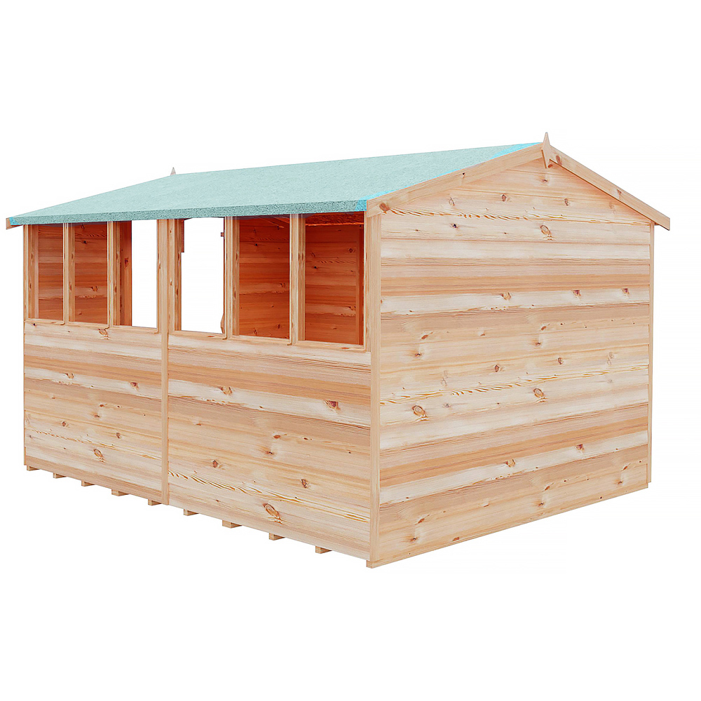 The Shire 10 x 8 feet overlap apex wooden shed offers secure storage for your gardening equipment. Its attractive design, highlighted by double doors, enhances any garden. Safety-glazed windows, which can be installed on either side, let in ample light while remaining non-opening. The double doors are positioned in the 8', gable end, and the high eaves provide easy access to all areas of the shed. Please note that we are currently unable to deliver to the following postcodes: DG, TD, KA, ML, EH, G, PA, FK, KY, PH, DD, AB, IV, and KW.