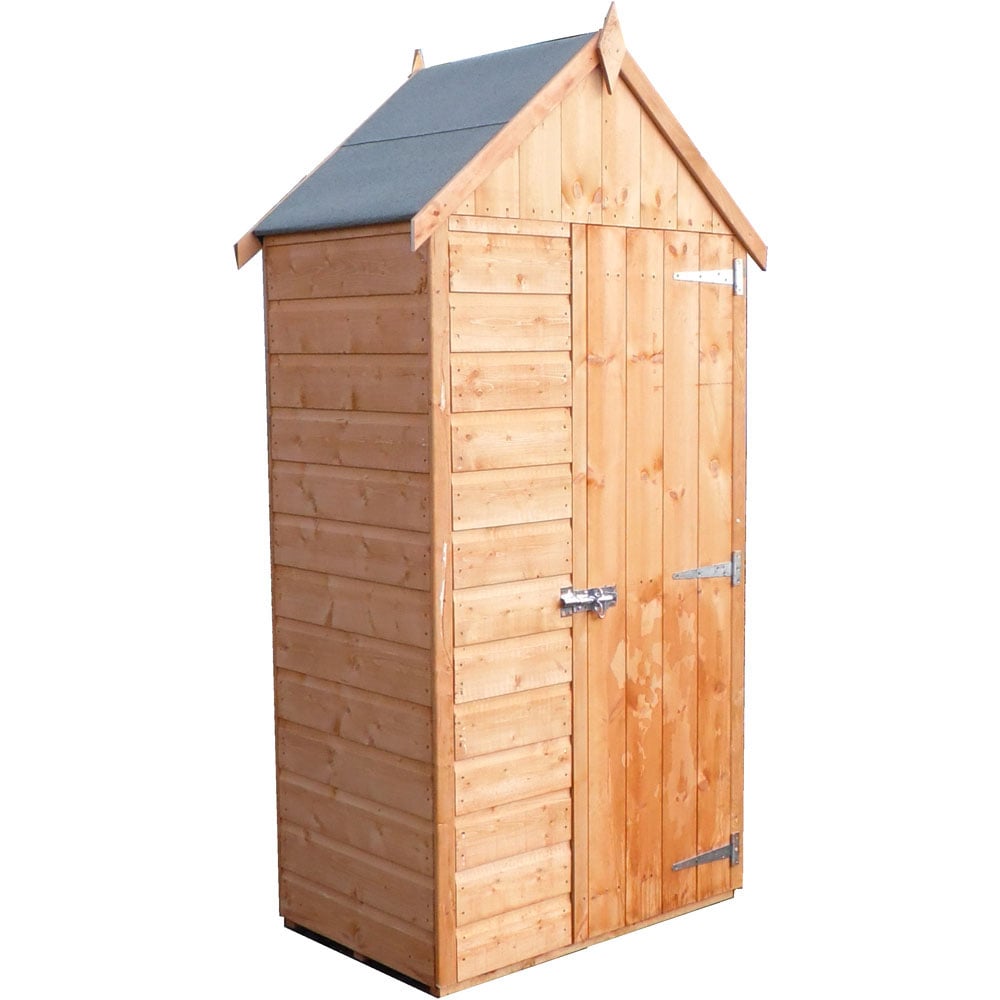 Keep your garden tools and equipment neatly stored with this compact outdoor store. Perfect for brooms, step ladders, muddy boots, and more, this handy unit will fit easily onto your patio. Made from high-grade FSC-certified northern European shiplap timber, it boasts a golden brown basecoat preservative treatment, ready for your own choice of paint or stain. The robust OSB board roof and floor ensure simple assembly. A fixing kit, roof felt, and instructions are included. Please note that we are currently unable to deliver to the following postcodes: DG, TD, KA, ML, EH, G, PA, FK, KY, PH, DD, AB, IV, and KW.