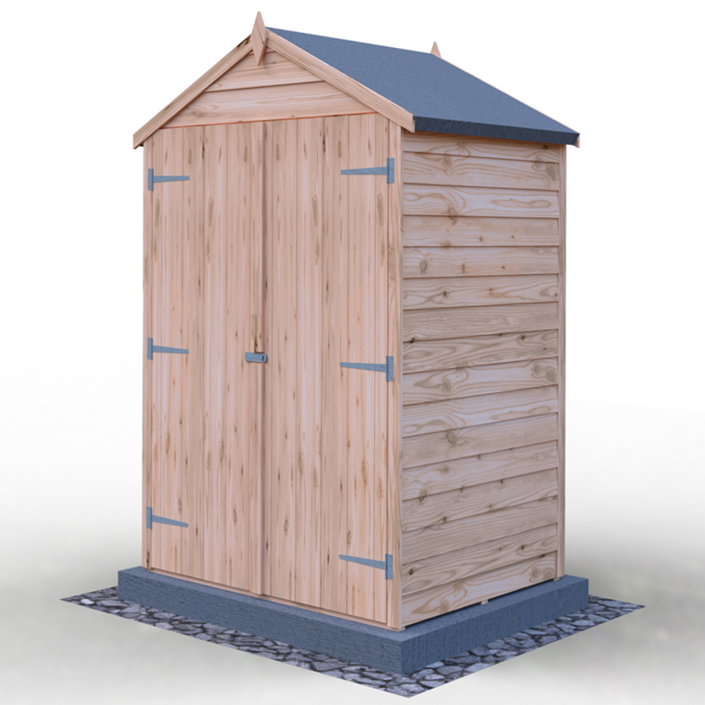 This compact wooden garden shed, measuring 4ft x 3ft, boasts wide double doors set within a 4ft gable end, and a spacious 6.4ft internal height for easy access. Its robust construction uses high-grade, slow-grown, FSC-approved European pine cladding boards over a 34mm square frame, complemented by solid OSB roof and floor panels. Security is enhanced by the absence of windows and the inclusion of a hasp and staple on the doors, ready for your padlock. Pre-treated with a basecoat, the shed is ready for your chosen topcoat. All necessary fixings, roof felt, and assembly instructions are supplied. (Imperial dimensions are approximate, please refer to the precise metric dimensions). Please note: Delivery is currently unavailable to the following postcodes: DG, TD, KA, ML, EH, G, PA, FK, KY, PH, DD, AB, IV, and KW.