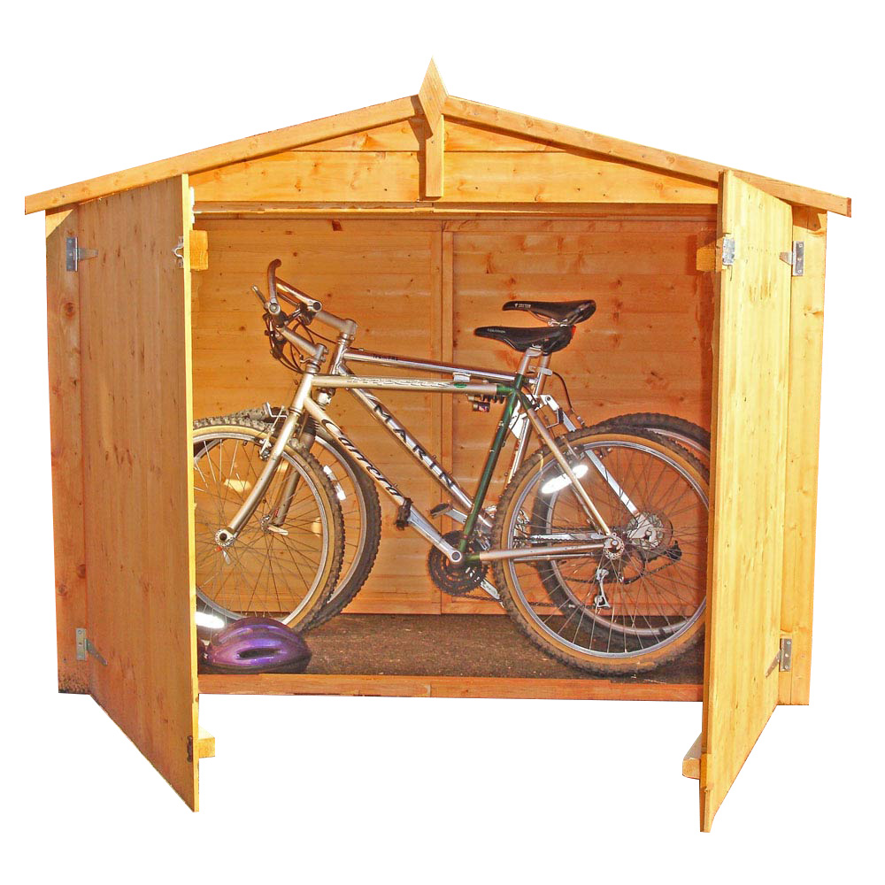 Keep your bikes safe and dry in this stylish bike store. Offering economical storage for up to three bicycles, it's equally suitable for garden equipment and outdoor toys. The attractive apex roof and wide double doors provide easy access, while a hasp and staple are fitted for added security (padlock not included). Constructed from durable, weather-resistant 12mm shiplap FSC Certified timber boards in a honey brown basecoat, the walls are ready for your personal touch. The solid OSB roof ensures simple installation, and the absence of a floor allows for effective water drainage. Home delivery, a fixing kit, roof felt, and comprehensive instructions are all included. Please note: Delivery is currently unavailable to the following postcodes: DG, TD, KA, ML, EH, G, PA, FK, KY, PH, DD, AB, IV, and KW.