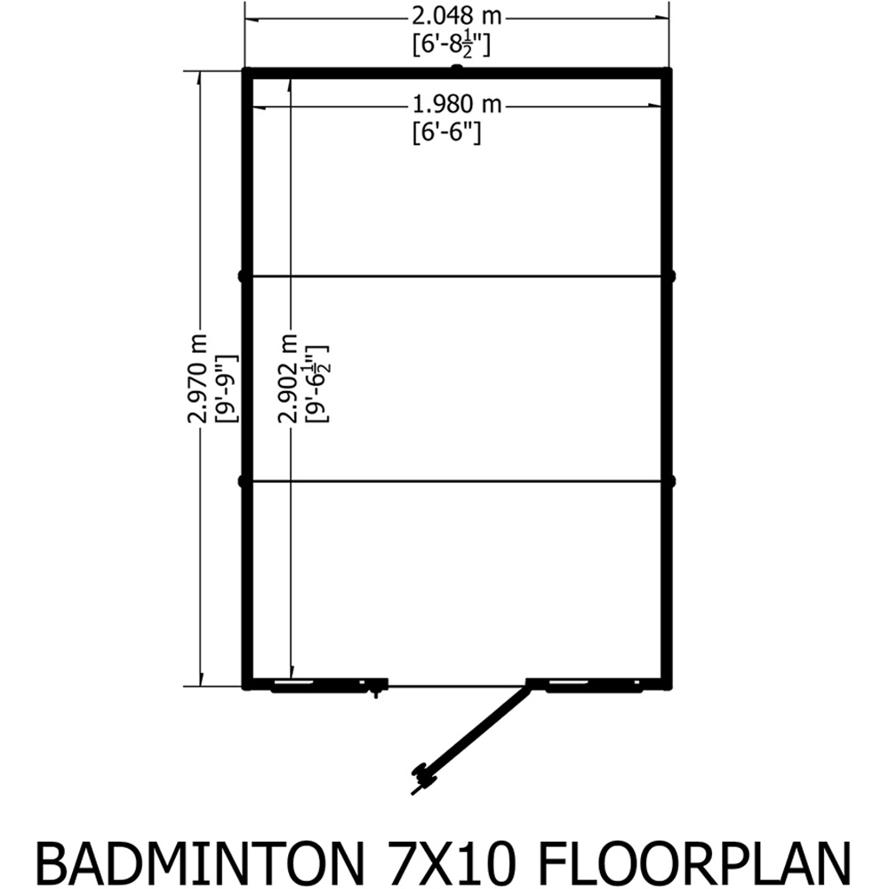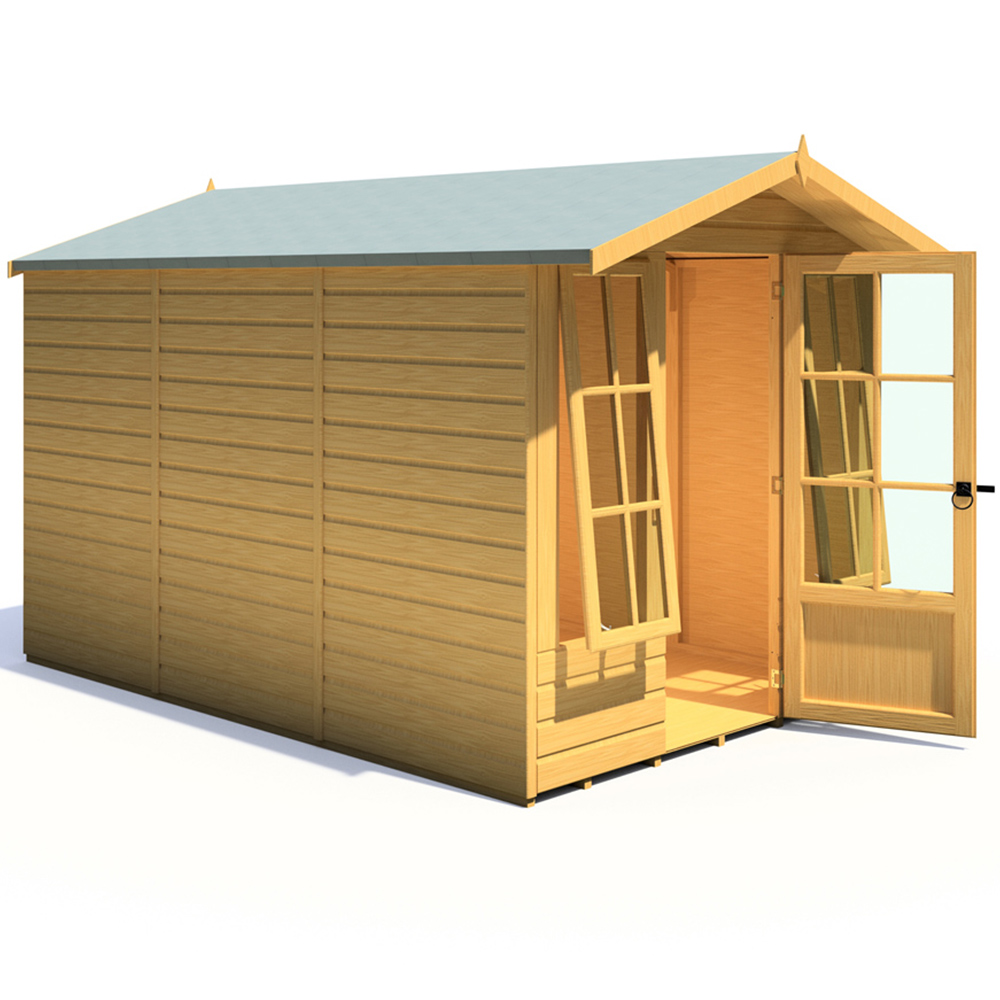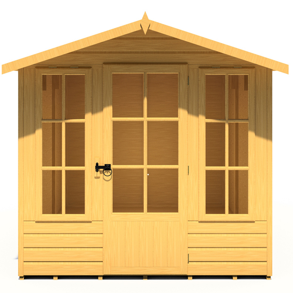 The Shire 7 x 10ft Badminton Summerhouse is a stylish addition to any garden. Its single front door and two opening windows, combined with a shaded veranda, create a perfect summer dining area. Built with robust 34mm square framing and planed shiplap tongue and groove boards from high-grade, slow-grown, FSC-approved Northern European pine, this summerhouse boasts quality construction. The 12mm tongue and groove roof and floor match the wall cladding. Storm-resistant windows and doors are expertly joinery-made. All necessary fixings, mineral roof felt, and assembly instructions are included. After ordering, you'll receive a link to schedule your delivery, live tracking information will be provided on delivery day. Please note that delivery is currently unavailable to DG, TD, KA, ML, EH, G, PA, FK, KY, PH, DD, AB IV, and KW postcodes.