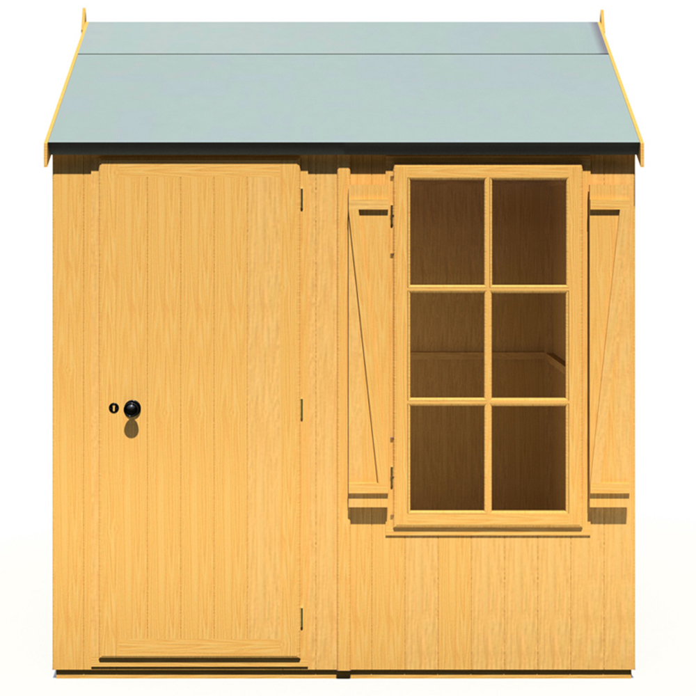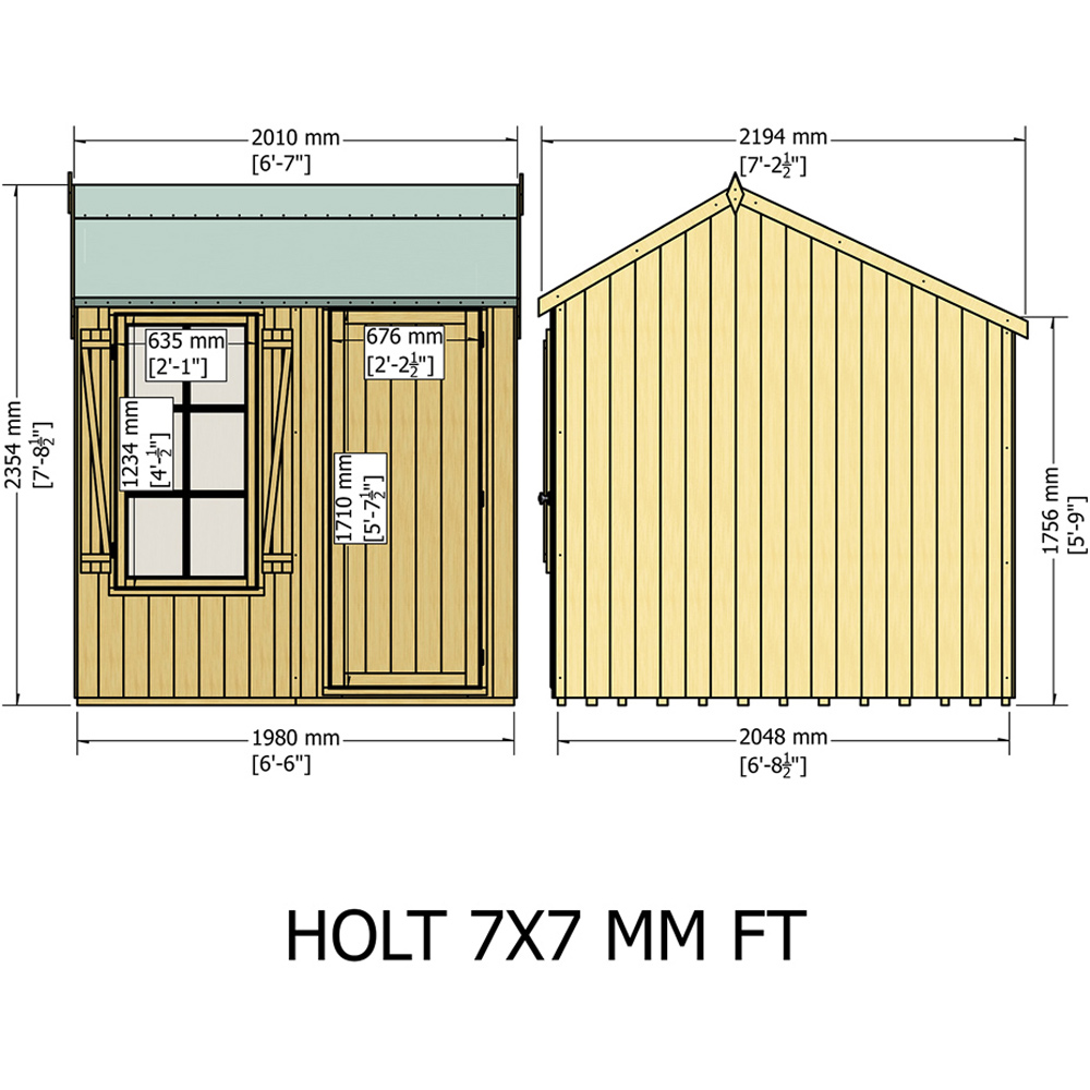 Enhance your outdoor space with the 7 x 7ft Holt Apex Garden Shed. Built for longevity, this shed boasts high-quality 12mm shiplap tongue and groove cladding and robust 34mm square framing. Natural light and ventilation are provided by an opening glass window, complemented by a single door with a rim lock—conveniently interchangeable with the window's position. The solid sheet OSB roof boards are protected by mineral roof felt. A dip-treated preservative base coat is applied, ready for your chosen topcoat of paint or stain. Following your order, you'll receive a link to schedule your delivery, with live tracking provided on the delivery day. Ensure a flat, level base of adequate size is prepared prior to assembly, grass, soil, or gravel are unsuitable due to shifting under the building's weight. Please note: Delivery is currently unavailable to DG, TD, KA, ML, EH, G, PA, FK, KY, PH, DD, AB, IV, and KW postcodes.