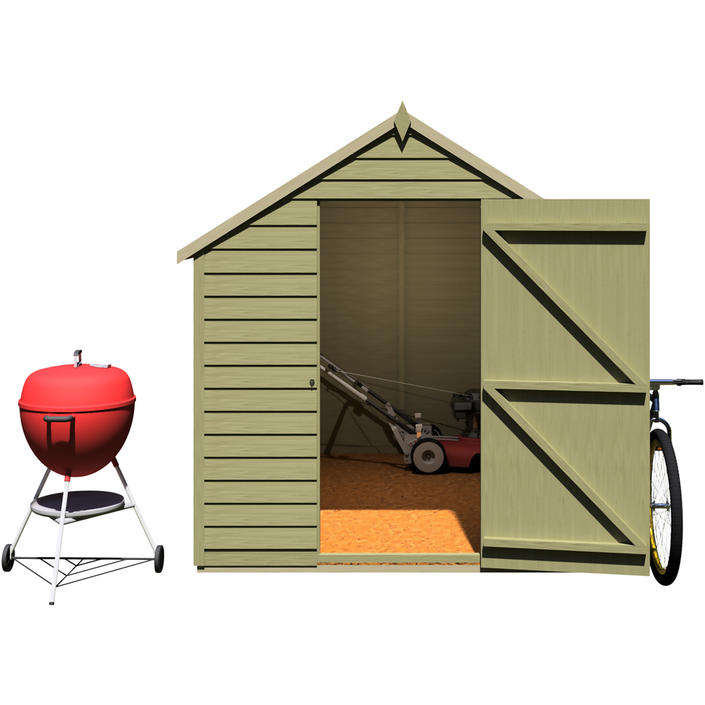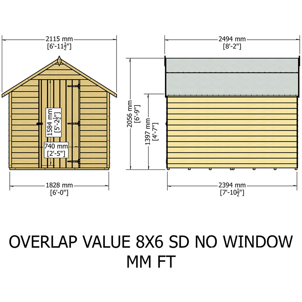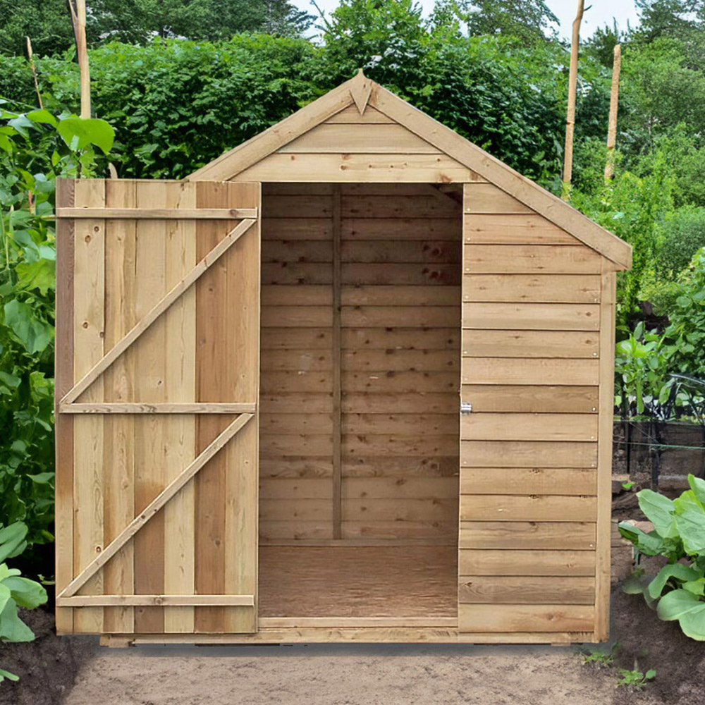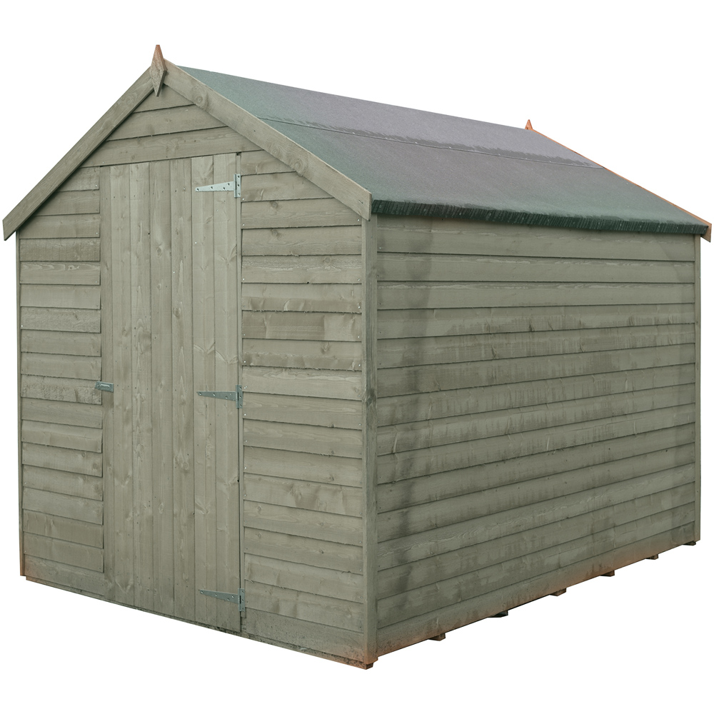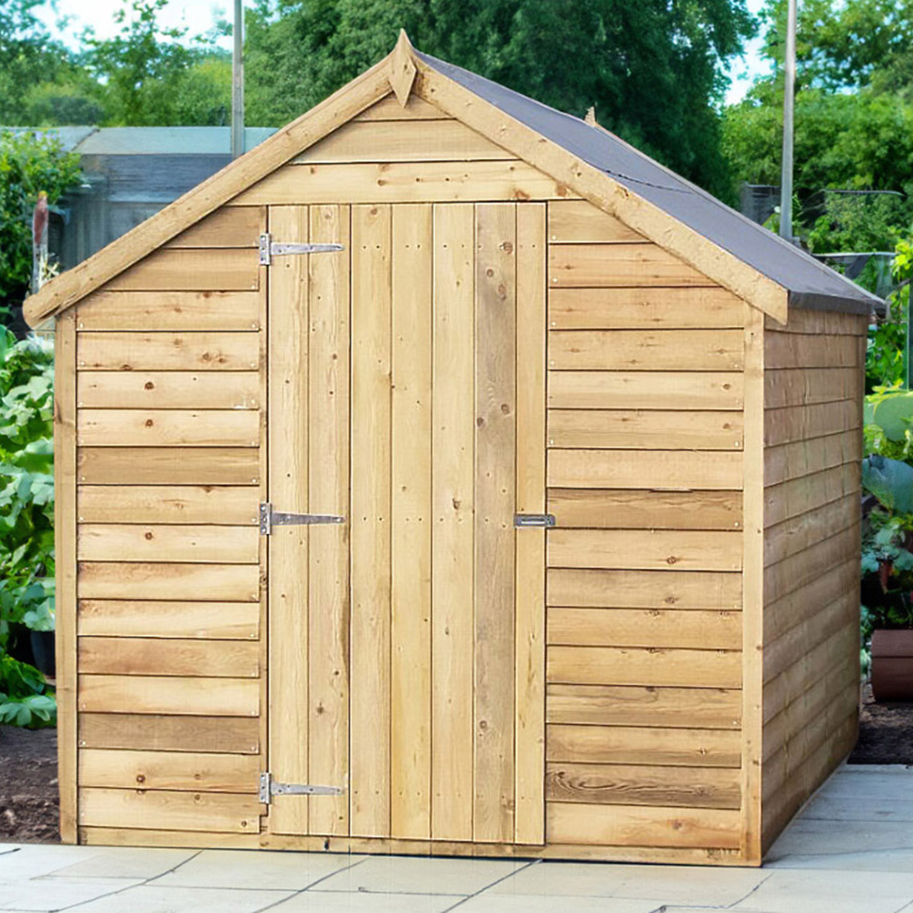 The Shire 8 x 6ft Overlap Apex Shed offers exceptional value. Constructed from high-quality, FSC-approved European pine cladding boards over sturdy 34mm square framing, it',s built to last. Security is assured with a single door featuring a hasp and staple catch. A solid sheet OSB roof and floor provide a robust base, finished with green mineral felt roofing. This model doesn',t include windows. All necessary fixings, roof felt, and assembly instructions are included. A flat and level base is essential for stability, grass, soil, or gravel are unsuitable. Delivery is available to most areas, excluding DG, TD, KA, ML, EH, G, PA, FK, KY, PH, DD, AB, IV, and KW postcodes. We apologise for any inconvenience caused by these exclusions, updates will be provided when delivery to these areas resumes. After ordering, you',ll receive a link to schedule your delivery and access live tracking information on the delivery day.