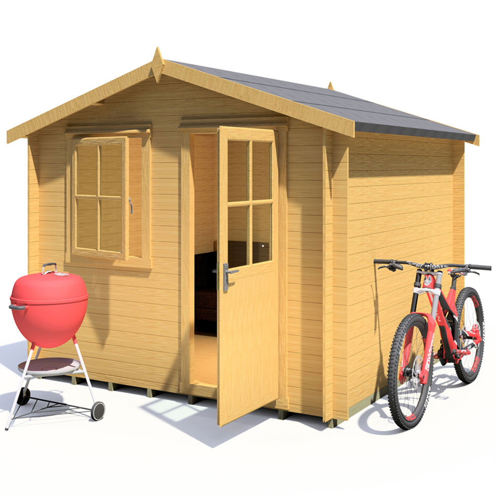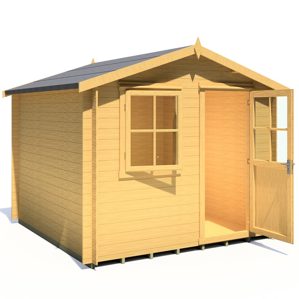 The Shire Avesbury 9 x 9ft Wooden Log Cabin boasts fully framed single doors and a joinery-quality opening window. Its tongue and groove roof and floor sit on pressure-treated bearers, and the door and window positions are interchangeable. The door features a pad bolt and a full-length piano-style hinge. Walls are constructed from interlocking 19mm thick timbers—50% thicker than typical garden buildings—while the roof and floor are 12mm thick. Supplied untreated, it's ready for paint or stain after assembly. Internal (floor) dimensions are critical, building dimensions are to the edge of the boards. The internal eaves height is a spacious 6 inches (1825mm). Note: This cabin is supplied as individual log boards, assembled length by length from the floor, not pre-made panels. Constructed in the UK from high-grade, FSC-approved Northern European Pine. Assembly instructions and mineral roof felt are included. Delivery scheduling and live tracking are provided post-order. A flat, level base is required (grass, soil, or gravel are insufficient). Currently unavailable for delivery to DG, TD, KA, ML, EH, G, PA, FK, KY, PH, DD, AB, IV, and KW postcodes.
