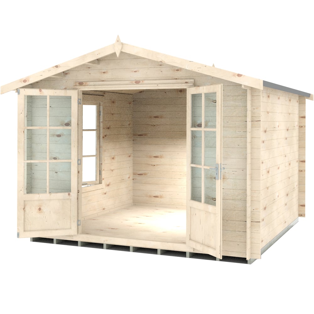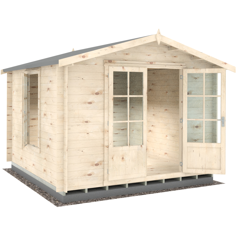 Create the perfect outdoor retreat with the Barnsdale 10 x 10ft Double Door Log Cabin. This cabin boasts glazed double doors and matching high-quality joinery, complemented by a versatile window that can be installed on either side. The tongue and groove roof and floor, supported by pressure-treated bearers, ensure durability. A secure, lockable door with a full-length piano-style hinge adds an extra layer of protection. The interlocking 19mm thick timbers—significantly thicker than typical garden buildings—form robust walls, while the roof and floor utilize 12mm thick boards. Supplied untreated, the cabin is ready for your personal touch with paint or stain upon assembly. For precise measurements, please refer to the internal floor dimensions, as external dimensions include the log overlaps. Enjoy a spacious interior with eaves exceeding six inches (1825mm). Please note: this cabin is constructed from individual log boards assembled length by length, starting from the floor, not pre-fabricated panels. Manufactured in the UK using high-grade, FSC-approved Northern European Pine, this cabin includes assembly instructions and mineral roof felt. After ordering, you’ll receive a link to schedule your delivery and enjoy live tracking on delivery day. A flat, level base of sufficient size is required, grass, soil, or gravel are unsuitable. Currently, delivery is unavailable to DG, TD, KA, ML, EH, G, PA, FK, KY, PH, DD, AB, IV, and KW postcodes.