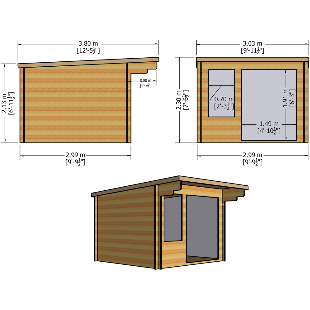 Enhance your outdoor space with the Belgravia 10 x 10ft Log Cabin. This UK-made cabin blends the charm of a traditional summerhouse with the robust build of a log cabin. The frameless interior creates an authentic feel, offering a comfortable space over 7ft high. A glazed front maximises natural light, while the roof canopy provides welcome shade. All glazing is toughened glass. High-quality mortise and tenon joinery, coupled with draft excluders, ensures a storm-resistant design. The lockable double doors and front-positioned opening window are interchangeable. The 15mm tongue and groove timber roof and floor, supported by pressure-treated bearers, promise longevity. Crafted from high-grade, slow-grown, FSC-approved northern European pine, the cabin is delivered untreated, ready for immediate painting or staining after installation. Please note: this cabin is supplied as individual log boards for length-by-length assembly, starting from the floor, not pre-assembled panels. All fixings, mineral roof felt, and assembly instructions are included. Account for roof overhang and necessary access during construction and treatment. A link for choosing your delivery day and live tracking will be provided. A flat, level base of sufficient size is required—grass, soil, or gravel are unsuitable. (Imperial dimensions are approximate, use metric dimensions for precision.) Currently, delivery is unavailable to DG, TD, KA, ML, EH, G, PA, FK, KY, PH, DD, AB, IV, and KW postcodes.