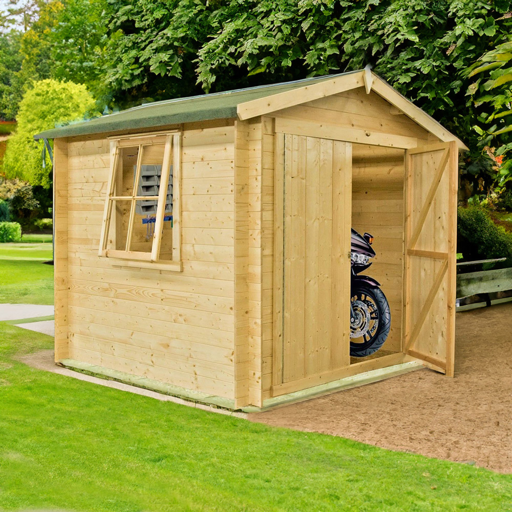 Create a charming retreat with the Shire Bradley 8 x 8ft Double Door Log Cabin. This sturdy cabin boasts fully framed double doors, high-quality joinery, and an opening window. The tongue and groove roof and floor, supported by pressure-treated bearers, ensure durability. Enhanced security is provided by a pad bolt and full-length piano-style hinges on the door. Its interlocking 19mm thick timbers—50% thicker than typical garden buildings—form the walls, while the roof and floor are constructed from 12mm thick boards. Delivered untreated, it's ready for your personal touch with paint or stain immediately after assembly. Internal floor dimensions are critical, please check these carefully as building dimensions are to the outer edge of the boards. Enjoy a spacious interior with a 6-inch (1825mm) internal eaves height. Built from individual log boards assembled length by length, starting with the floor (not pre-fabricated panels), this cabin is crafted in the UK using high-grade, FSC-approved Northern European Pine. Mineral roof felt and assembly instructions are included. Post-order, you'll receive a link to schedule your delivery and benefit from live tracking on delivery day. A flat, level base of sufficient size is required (grass, soil, or gravel are insufficient). Please note: Delivery is currently unavailable to DG, TD, KA, ML, EH, G, PA, FK, KY, PH, DD, AB, IV, and KW postcodes.
