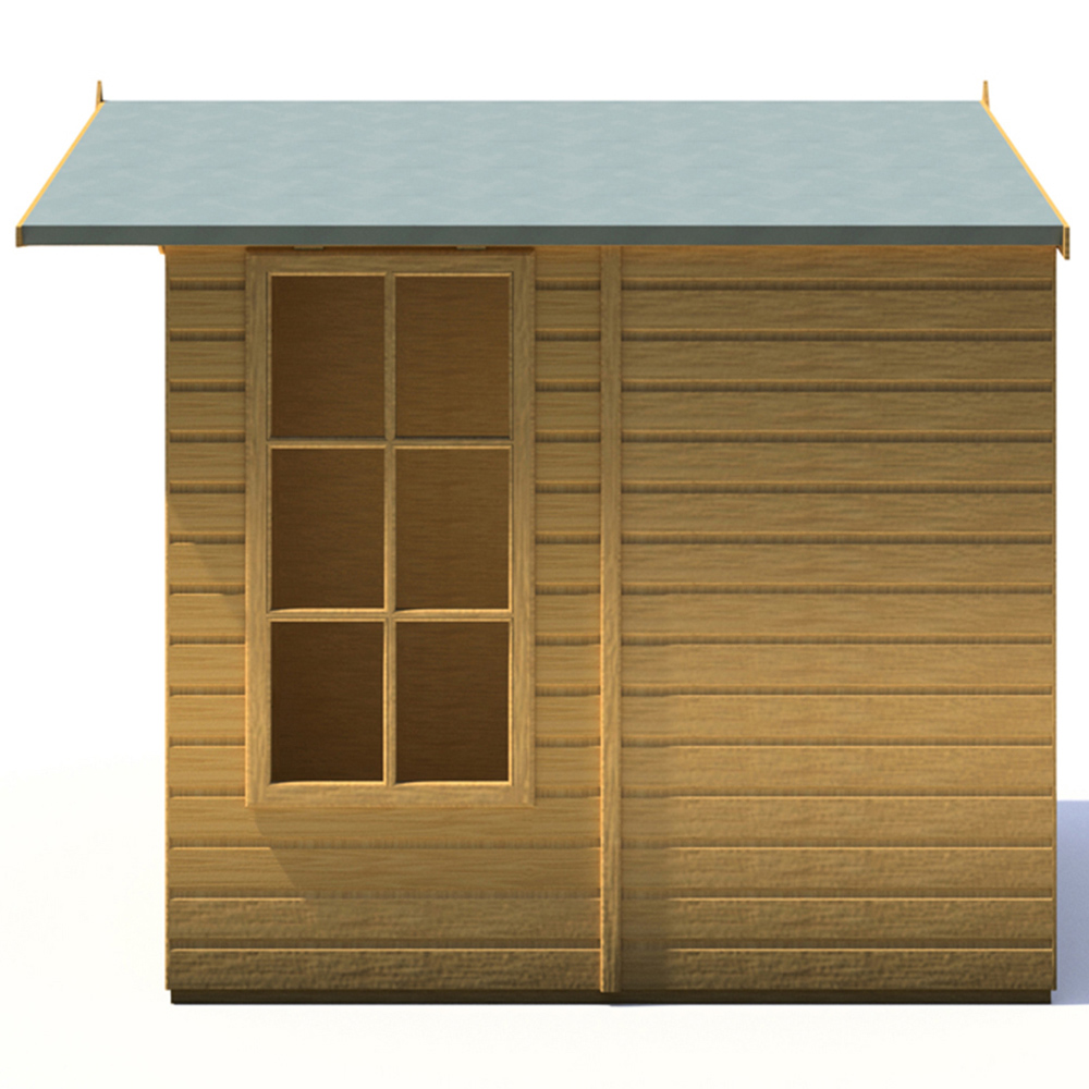 The Shire Buckingham Summerhouse offers a stylish addition to any garden. This 7' x 7' double-door structure boasts high-quality double doors opening to the front, and a large Georgian side window, easily installable on either side. Crafted from high-grade, slow-grown, FSC-approved European pine cladding boards over 34mm square framing, this summerhouse provides ample storage space. The sturdy construction includes solid sheet OSB for the roof and floor, and the structure is pressure treated for lasting durability. Included are all necessary fixings, roof felt, and assembly instructions. A perfect choice for all gardens. Note: Currently, we're unable to deliver this product to DG, TD, KA, ML, EH, G, PA, FK, KY, PH, DD, AB, IV, and KW postcodes. We regret the inconvenience and will keep you posted when it's available to order for the mentioned postcodes.