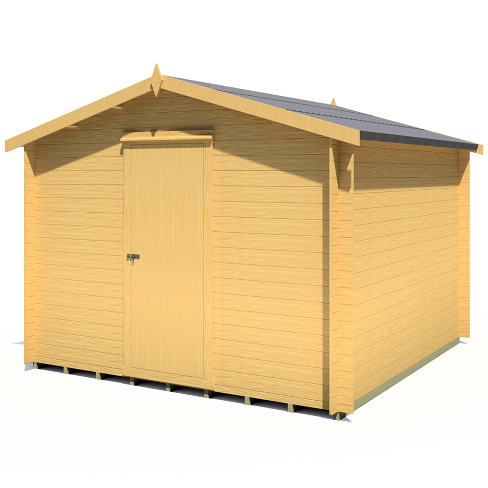 Make the most of your outdoor space with the Shire Camelot 10 x 10ft Wooden Log Cabin. This robust cabin boasts a fully framed single door and a joinery-quality opening window complete with shutter. The tongue and groove roof and floor sit atop pressure-treated bearers, providing a solid foundation. Security is enhanced by the door's full-length piano-style hinge. The side-hung opening window meets joinery standards. Its storm-resistant design ensures lasting service. The interlocking 19mm thick timber walls are 50% thicker than standard garden sheds, while the roof and floor are 12mm thick. Note: Log cabin dimensions are to the edge of the boards, please check internal (floor) sizes. The internal eaves height is a generous 6 inches (1825mm). Crafted in the UK from high-grade, FSC-approved Northern European Pine, this cabin includes the floor as standard. Supplier delivery typically takes two to four weeks, but may be longer during peak periods. Customer presence is required upon delivery. Please note: Delivery is currently unavailable to DG, TD, KA, ML, EH, G, PA, FK, KY, PH, DD, AB, IV, and KW postcodes.