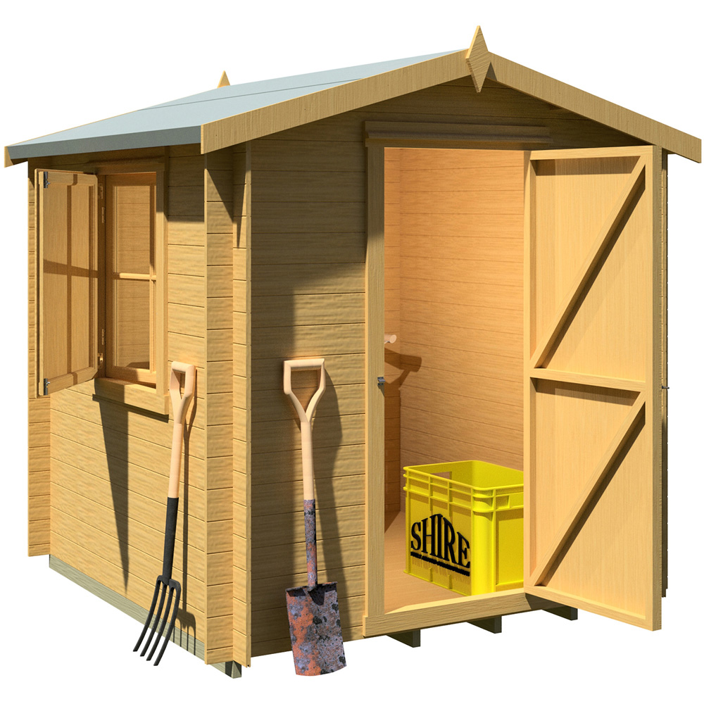 Make the most of your outdoor space with the Shire Camelot 7 x 7ft Wooden Log Cabin. This robust cabin boasts a fully framed single door and a joinery-quality opening window complete with shutter. The tongue and groove roof and floor sit atop pressure-treated bearers, enhancing durability. Security is boosted by the door's full-length piano-style hinge. The side-hung opening window meets joinery standards. Its storm-resistant design ensures years of reliable service. The interlocking timber walls are a substantial 19mm thick—50% thicker than standard garden sheds—while the roof and floor are 12mm thick. Note: Log cabin dimensions are to the edge of the boards, please check internal (floor) sizes. The internal eaves height is a generous 1825mm (six inches). Crafted in the UK from high-grade, FSC-approved Northern European Pine, and with the floor included, this cabin offers exceptional value. Please note: Delivery is currently unavailable to DG, TD, KA, ML, EH, G, PA, FK, KY, PH, DD, AB, IV, and KW postcodes.