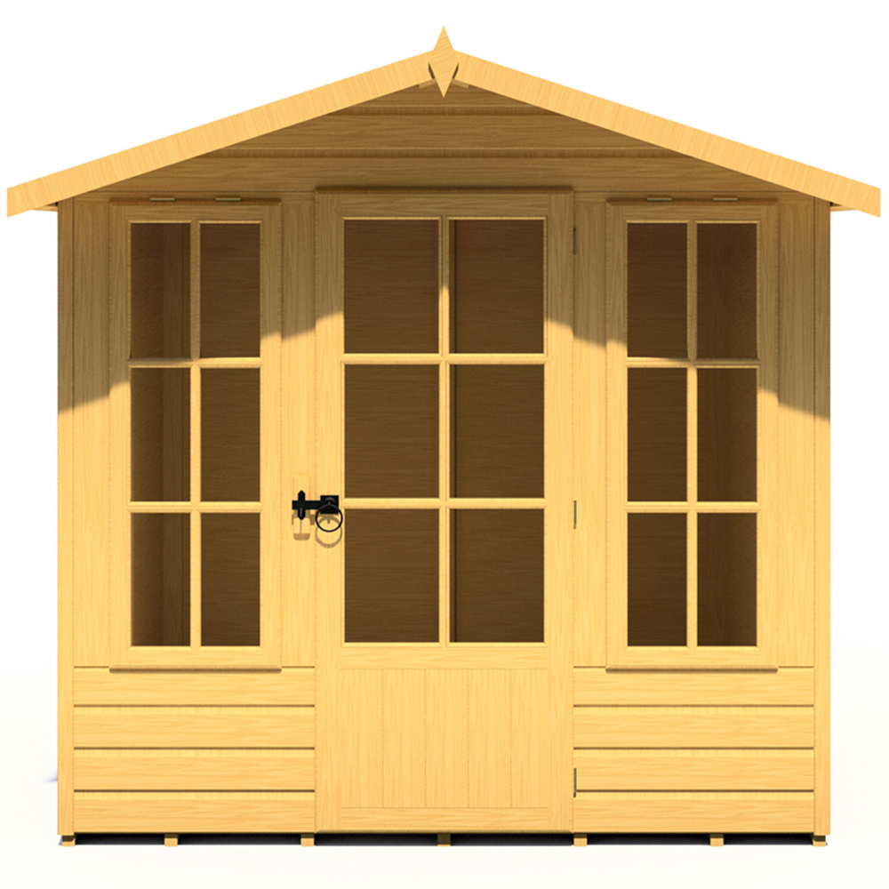 The Chatsworth Summerhouse Shed, a stylish addition for your garden, boasts Georgian-style windows and a door. Constructed on sturdy framing and clad with planed shiplap tongue-and-groove boards, it's built from high-grade, slow-grown, FSC-approved Northern European pine. Ideal for summer relaxation or winter storage, the 7' x 7' summerhouse offers a delightful outdoor space. The glazed doors, set within the gable, feature Perspex safety glazing. A dip-treated base coat preservative is included, ready for your chosen top coat upon installation. The floor is tongue-and-groove, and the roof is solid sheet OSB. Please note: Delivery is currently unavailable to DG, TD, KA, ML, EH, G, PA, FK, KY, PH, DD, AB, IV, and KW postcodes. We'll keep you updated on availability.
