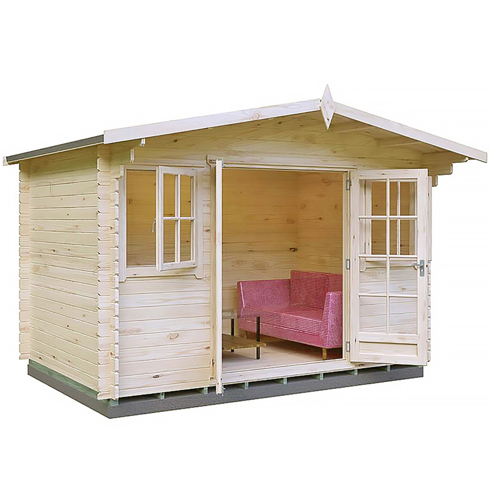Create a beautiful outdoor retreat with the Shire Clipstone 12 x 8ft Double Door Log Cabin. This stunning cabin offers a versatile space perfect for relaxation or work. The unique frameless interior design, crafted from interlocking 28mm thick timbers, creates a striking visual appeal. Enjoy ample natural light through the double doors and opening front windows, all fitted with toughened glass for safety and featuring draught excluders to maintain a cosy atmosphere. The doors are also fitted with a mortice lock. The 15mm tongue and groove roof and floor (with pressure-treated bearers for the floor) ensure durability. The internal eaves height of 6'10" / 2.086m provides a spacious feel. Built in the UK from high-grade, FSC-approved Northern European Pine, the cabin arrives untreated, ready for your personal touch with paint or stain. Assembly instructions and mineral roof felt are included. After ordering, you'll receive a link to schedule your delivery, followed by live tracking information on delivery day. Please note that building dimensions are to the external edge of the boards and log cabins are supplied as individual log boards, assembled length by length, starting from the floor, they are not pre-made panels. A solid, flat, and level base is required (beyond grass, soil, or gravel). Currently, delivery is unavailable to DG, TD, KA, ML, EH, G, PA, FK, KY, PH, DD, AB, IV, and KW postcodes. Internal (floor) dimensions should be checked where precise measurements are critical.