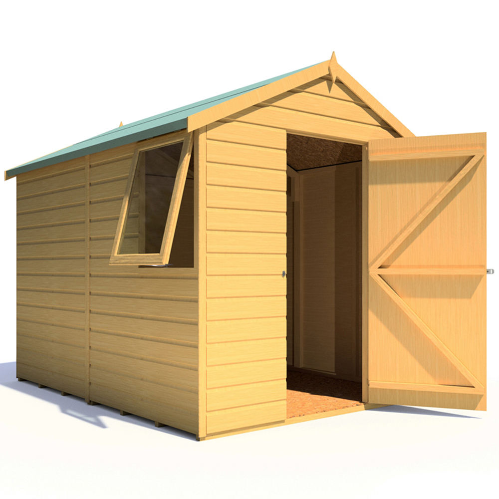 This sturdy and stylish 8 x 6ft wooden shed, crafted in Britain, provides excellent value. Constructed with high-quality 12mm shiplap tongue and groove timber walls, a solid OSB roof and floor, and robust 34mm square framing, it',s built to last. The shed includes one opening window and arrives pre-treated with a base coat preservative, ready for your final coat of paint. All fixings and roof felt are included, along with comprehensive assembly instructions. The dimensions given are external, please cheque the metric measurements for precise sizing. Please note that delivery is currently unavailable to the following postcodes: DG, TD, KA, ML, EH, G, PA, FK, KY, PH, DD, AB, IV, and KW.