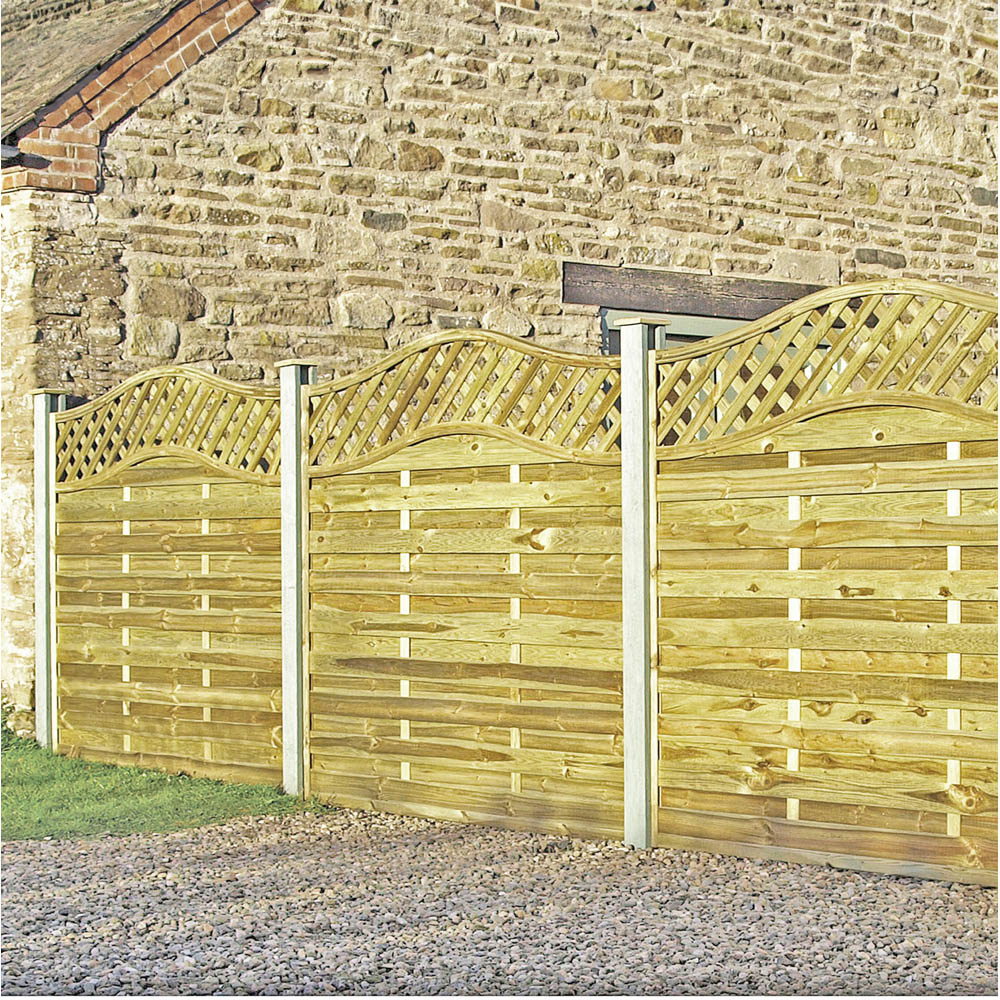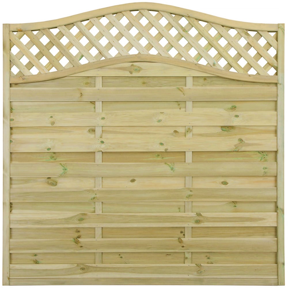 Enhance your garden',s aesthetic with the Shire Elite Meloir Panel, a 6ft x 6ft (180cm wide) masterpiece. This panel boasts a sophisticated design featuring horizontal timber slats and a wave top lattice. Precision-crafted with planed, rounded, and grooved elements securely fixed within a robust rebated frame, its pressure-treated timber ensures lasting durability and visual appeal. Please note that delivery is currently unavailable to DG, TD, KA, ML, EH, G, PA, FK, KY, PH, DD, AB, IV, and KW postcodes. We apologise for any inconvenience and will update you when delivery to these areas resumes.