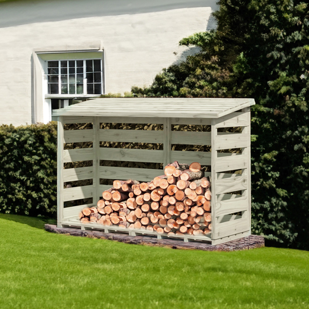 Organise your outdoor space with the Shire GB 6 x 3ft Pressure Treated Log Store. This attractive log store keeps logs tidy and dry, featuring slatted sides, a raised floor for air circulation, and a timber pent roof for rain protection. It is made from high-grade, slow-grown, FSC-approved northern European pine with a sturdy 34 mm square framing. With a pressure-treated finish for durability and low maintenance, it comes in a natural finish that can be stained or painted to match your garden. This log store complements log burners, fire pits, or chimineas. Assembly instructions are provided, but currently, they cannot be delivered to DG, TD, KA, ML, EH, G, PA, FK, KY, PH, DD, AB IV and KW areas.