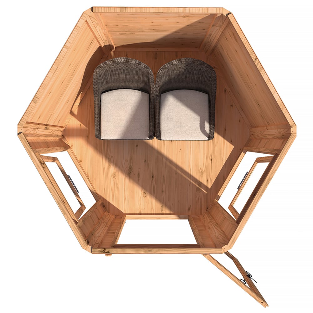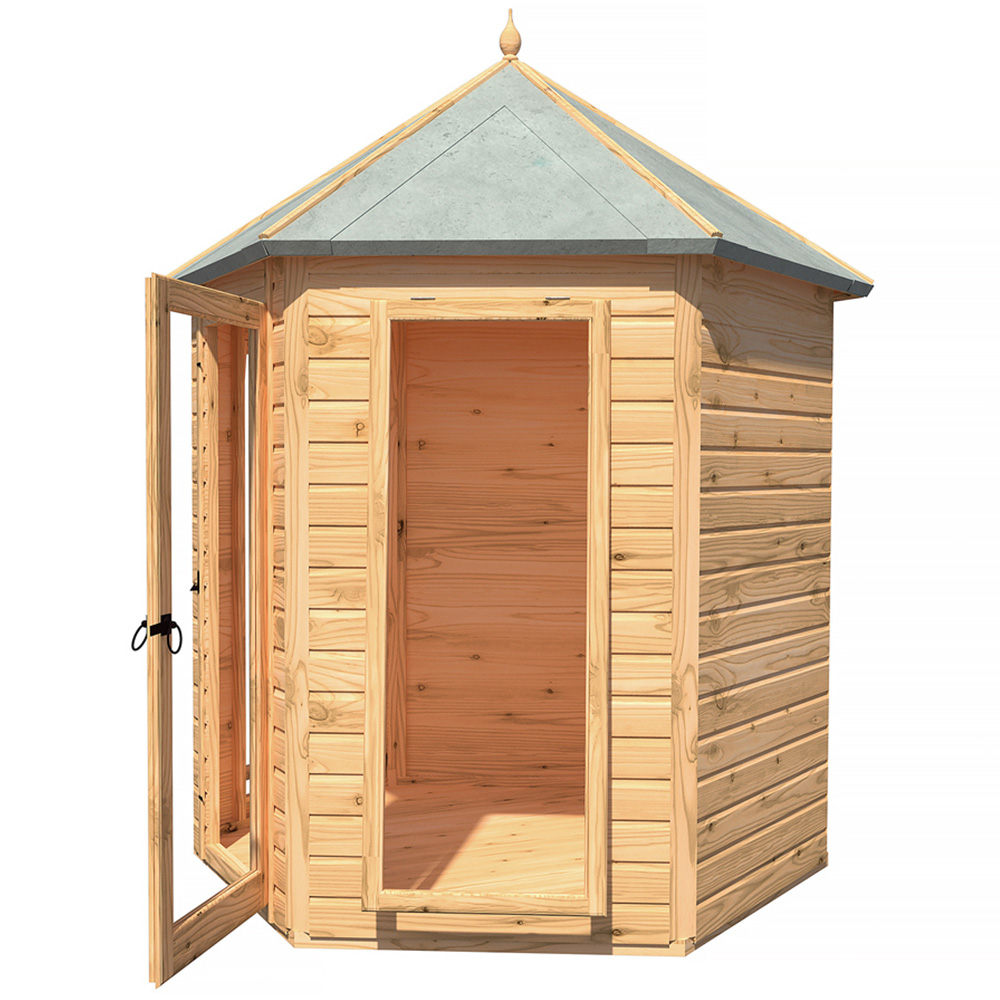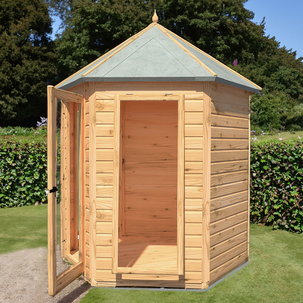 Make everyday feel like a holiday with Shire GB Kendall 6 x 6ft Single Door Hexagonal Shaped Shiplap Summerhouse. Its hexagonal shape makes it stunning focal point while providing cosy space to sit and enjoy your surroundings. Designed to improve your garden appearance, this summerhouse features wide single door at the front, offering easy access for furniture and bright, open feel. Built on solid 34mm square frame, it features shiplap tongue and groove cladding, crafted from high-grade, slow-grown, FSC-approved, Northern European pine for durability and premium finish. Solid timber tongue and groove roof and floor add strength and stability. Similarly, acrylic safety glazing and opening window let in abundant natural light. Pre-treated with dipped base coat, it is ready for your choice of top coat to complete the look. Supplied with all fixings, roof felt, and clear assembly instructions for easy setup. Please note that this product is not currently delivered to DG, TD, KA, ML, EH, G, PA, FK, KY, PH, DD, AB IV and KW areas and you will get update when it becomes available for the mentioned postcodes.