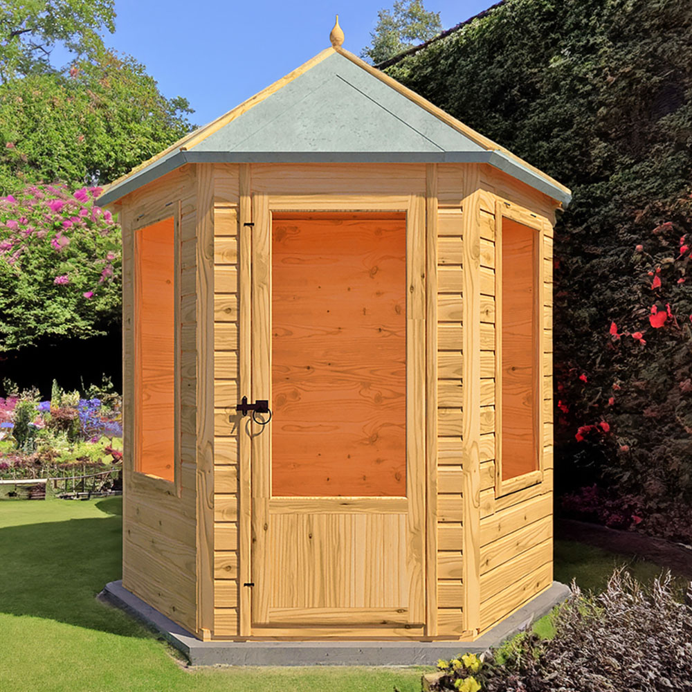 Design your dream garden escape with Shire GB Keswick 6 x 6ft Single Door Hexagonal Shaped Shiplap Summerhouse. Its hexagonal shape makes it stunning focal point while providing cosy space to sit and enjoy your surroundings. Designed to improve your garden appearance, this summerhouse features wide single door at the front, offering easy access for furniture and bright, open feel. Built on solid 34mm square frame, it features shiplap tongue and groove cladding, crafted from high-grade, slow-grown, FSC-approved, Northern European pine for durability and premium finish. Solid timber tongue and groove roof and floor add strength and stability. Similarly, acrylic safety glazing and opening window let in abundant natural light. Pre-treated with dipped base coat, it is ready for your choice of top coat to complete the look. Supplied with all fixings, roof felt, and clear assembly instructions for easy setup. Please note that this product is not currently delivered to DG, TD, KA, ML, EH, G, PA, FK, KY, PH, DD, AB IV and KW areas and you will get update when it becomes available for the mentioned postcodes.