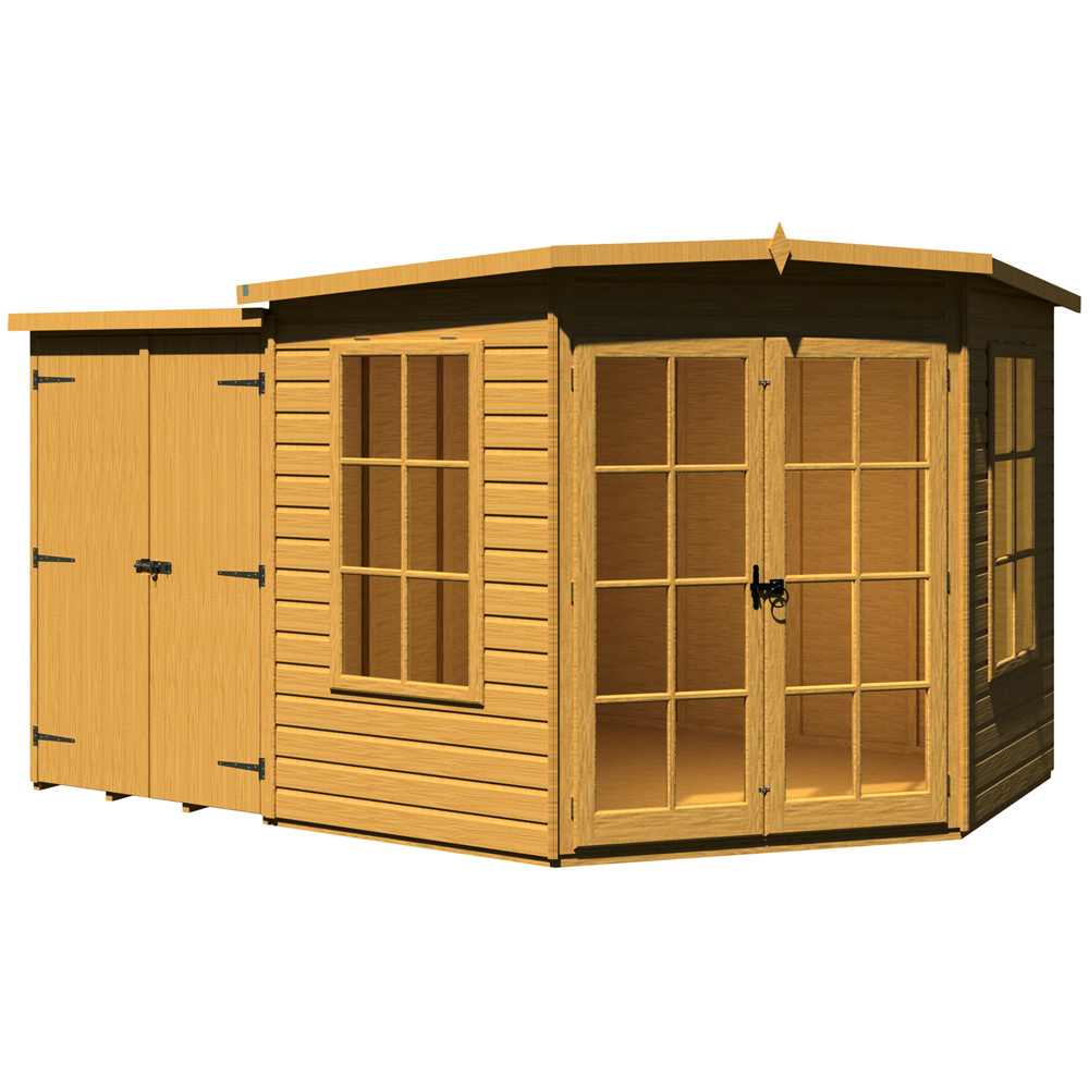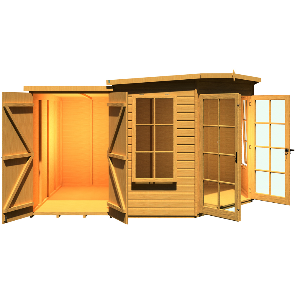 Create a charming retreat in your garden with the Hampton 8 x 12ft Double Door Corner Summerhouse and Side Shed. This thoughtfully designed summerhouse, perfect for corner placement, provides a delightful garden room complemented by a handy separate storage shed. Enjoy abundant natural light streaming through the fully glazed, large double doors and two joinery-quality opening windows. Constructed with robust 34mm square framing, it boasts planed 12mm shiplap tongue and groove cladding crafted from premium, slow-grown, FSC-approved Northern European pine. The floor and roof share this same high-quality 12mm tongue and groove construction. Pre-treated with a dip-treated base coat preservative, it's ready for your personal touch—a paint or stain of your choice—upon installation. Please note roof overhang and allow for access during installation and painting. A level, solid base (grass, soil, or gravel are unsuitable) is required for assembly. Imperial dimensions are approximate, precise metric measurements are provided separately. Post-order, you'll receive a link to schedule your delivery, followed by live tracking on delivery day. Please note: Delivery is currently unavailable to DG, TD, KA, ML, EH, G, PA, FK, KY, PH, DD, AB, IV, and KW postcodes.
