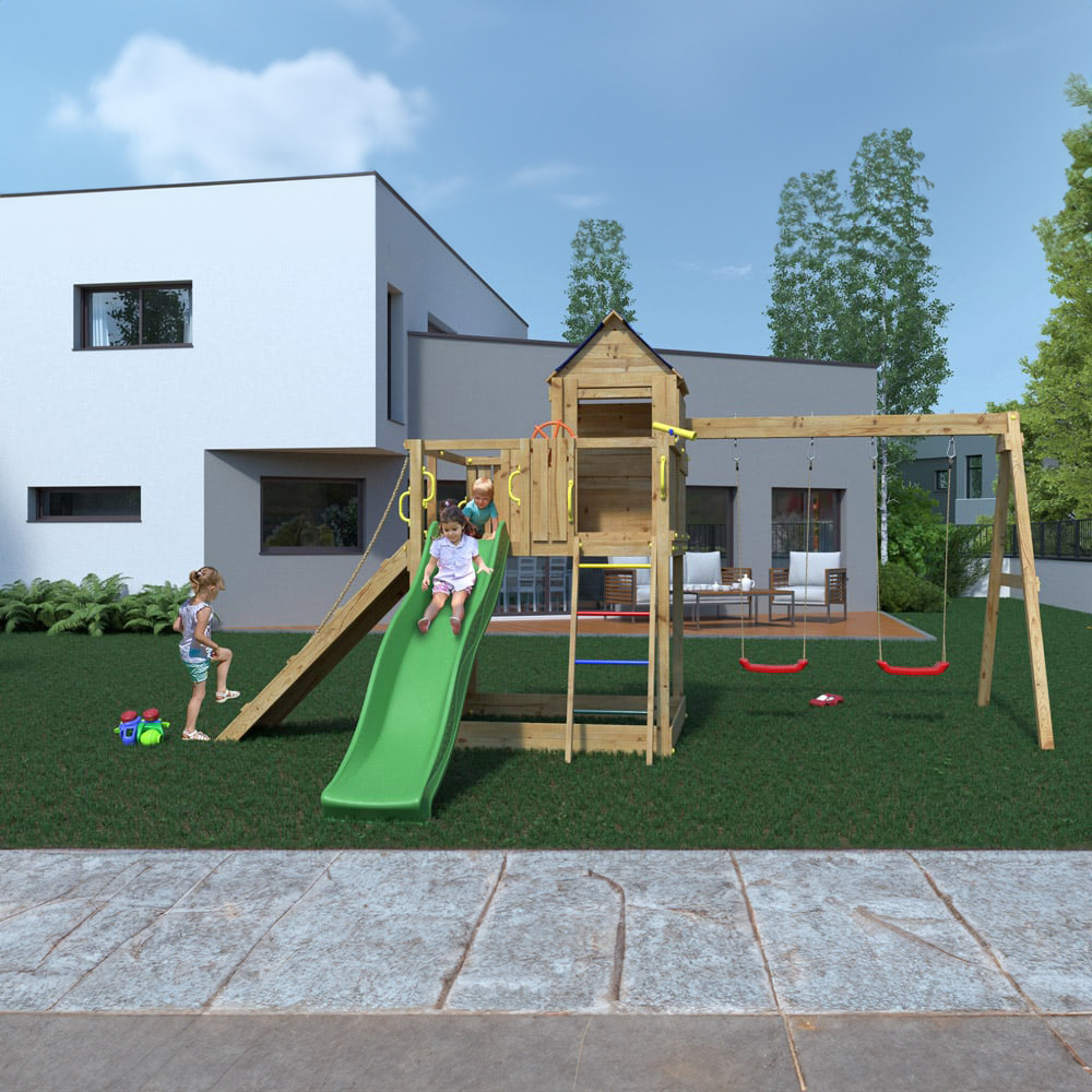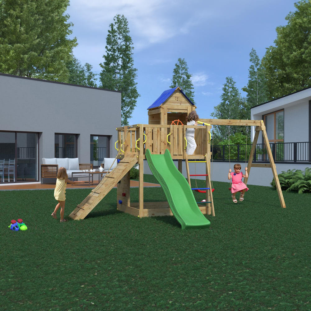 Wow! A Shire Kids Treehouse with Double Swing – the ultimate adventure base for young explorers! This amazing play set features a rock-climbing wall, a double swing, a slide, and a steering wheel with a lookout telescope. The spacious platform tower sparks endless imaginative play. It's designed to get kids active, both mentally and physically! Includes assembly tools and instructions, plus anchors for secure ground fixing. A guaranteed winner! Please note: Delivery is currently unavailable to DG, TD, KA, ML, EH, G, PA, FK, KY, PH, DD, AB IV, and KW postcodes.