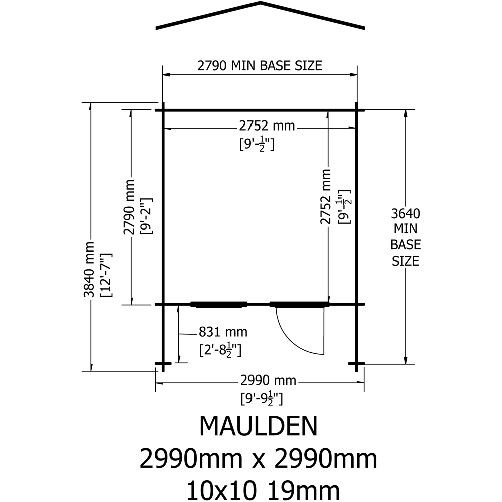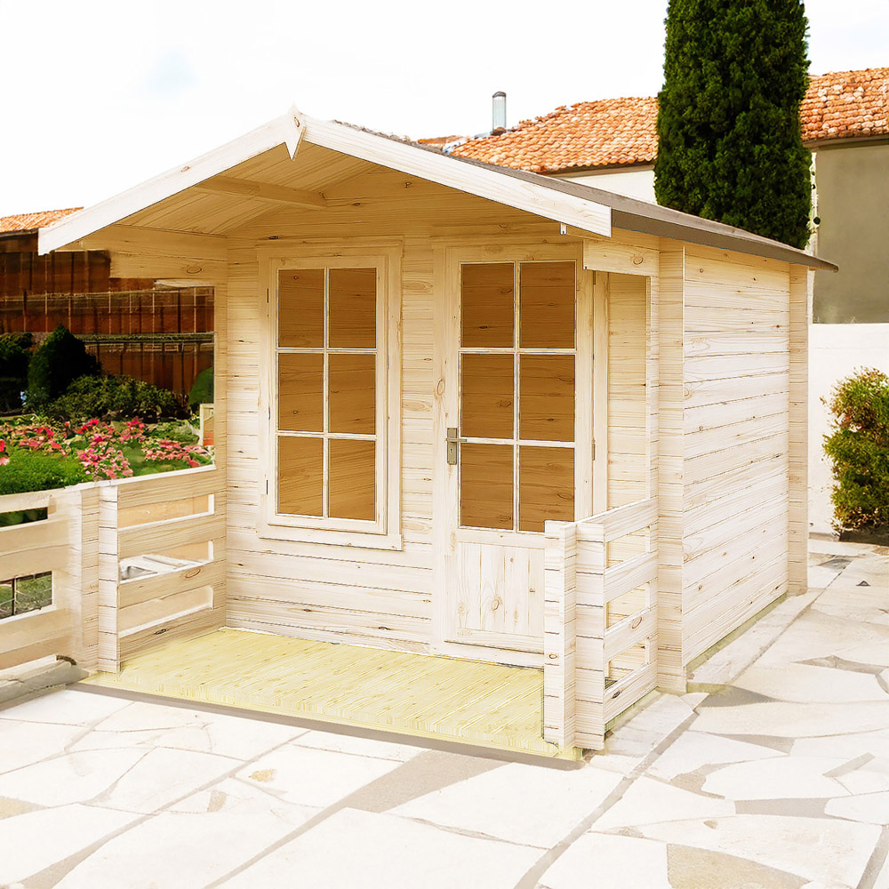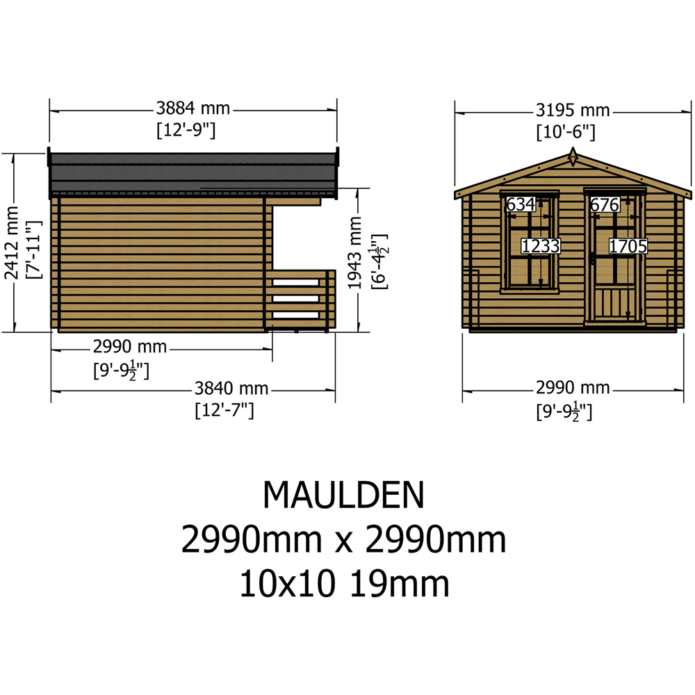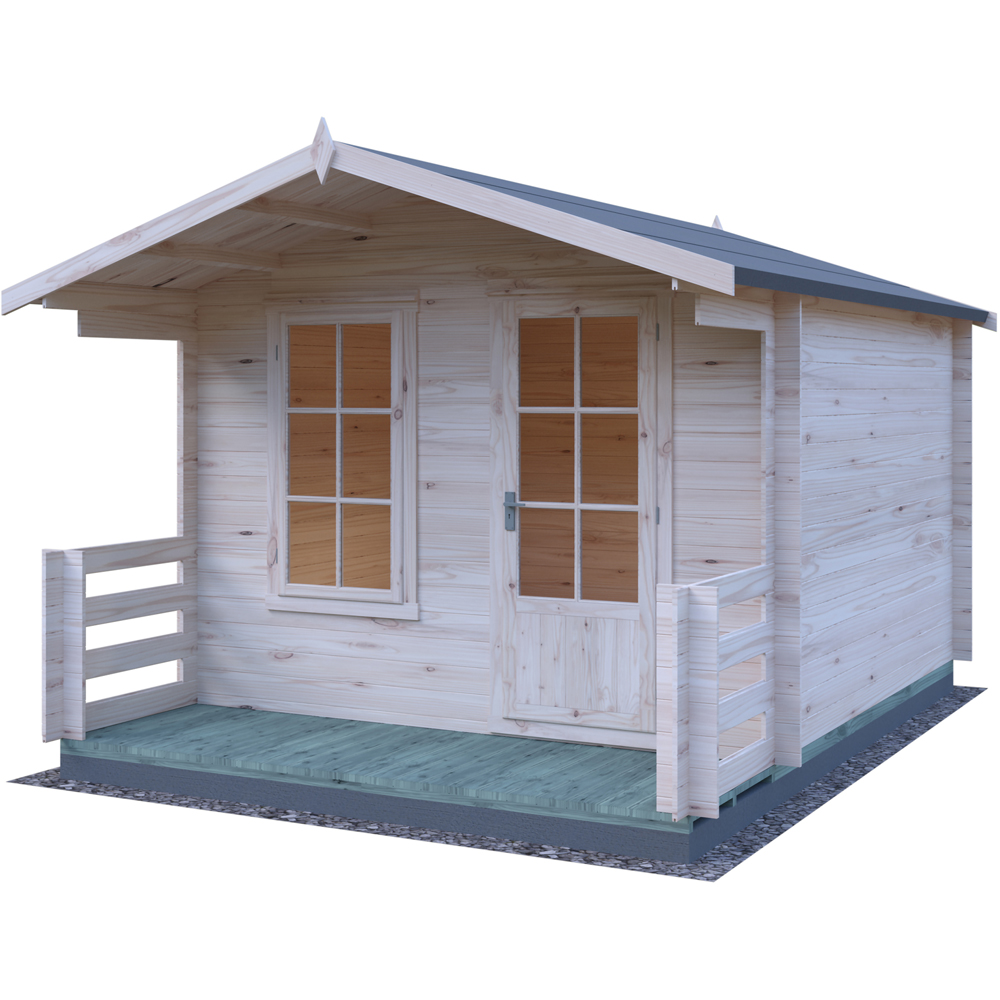 Create a stunning outdoor retreat with the Shire Maulden 10 x 10ft Log Cabin, complete with a veranda. This versatile cabin boasts a glazed single door and a matching high-quality opening window, with the added benefit of interchangeable positions. The robust construction features 19mm thick interlocking timbers (50% thicker than standard garden buildings!), 12mm tongue and groove roof and floor boards, and pressure-treated bearers for lasting durability. A secure, lockable door with a full-length piano-style hinge provides enhanced security. The spacious interior includes internal eaves measuring over six inches (1825mm). Built length by length from individual log boards, starting with the floor, this cabin is made in the UK from high-grade, FSC-approved Northern European Pine. Assembly instructions and mineral roof felt are included. Following your order, you'll receive a delivery scheduling link and live tracking information. A solid, level base is essential (grass, soil, or gravel are not suitable). Please note that delivery is currently unavailable to the following postcodes: DG, TD, KA, ML, EH, G, PA, FK, KY, PH, DD, AB, IV, and KW.