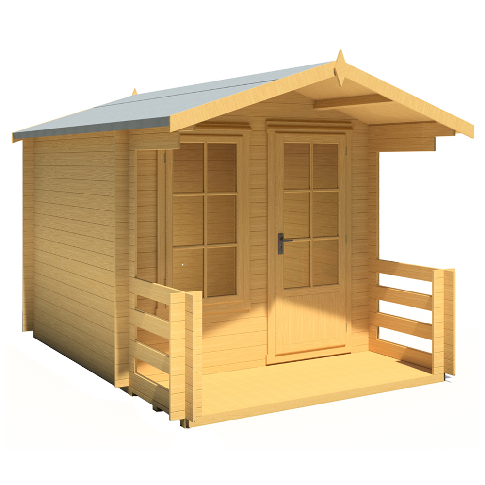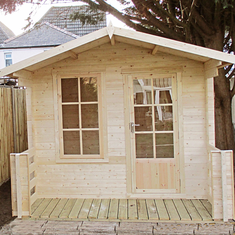 Add the Shire 8 x 8ft Maulden Log Cabin Shed to your garden and enjoy a beautiful new outdoor space. This premium cabin boasts a high-quality Georgian window and door, complemented by a decked terrace. Constructed from 19mm interlocking high-grade pine boards with tongue and groove walls, it offers dependable quality and attractive design. Please note that delivery is currently unavailable to the following postcodes: DG, TD, KA, ML, EH, G, PA, FK, KY, PH, DD, AB, IV, and KW. We apologise for any inconvenience and will inform you when delivery is possible to these areas.