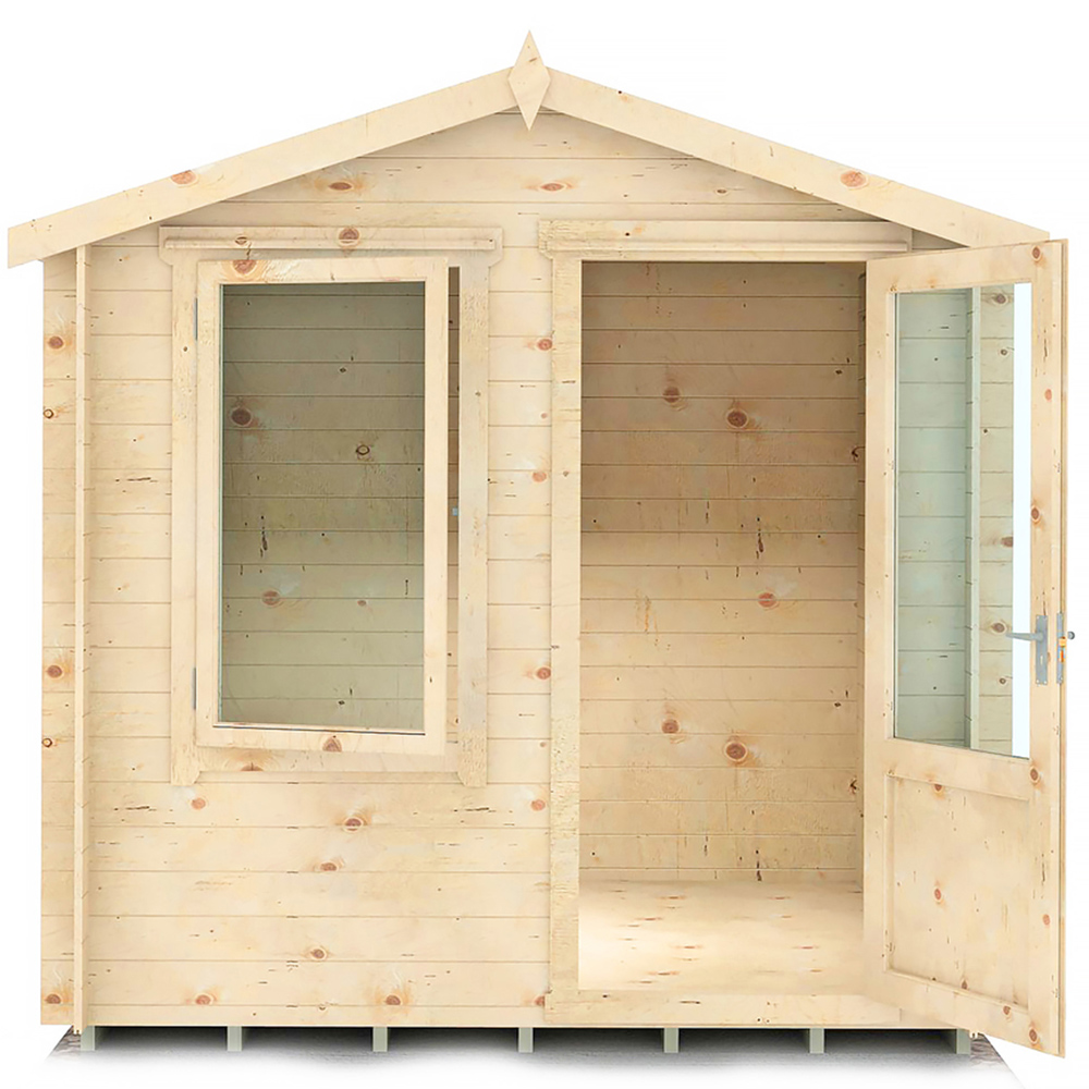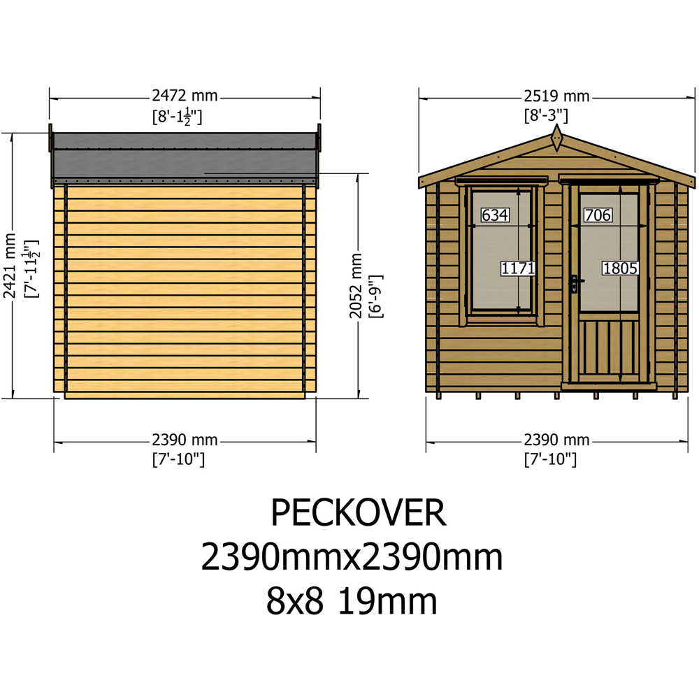 Create a stunning outdoor retreat with the Shire Peckover 8 x 8ft Log Cabin. This cabin offers superior quality with a fully framed single door, an open window, and a lockable door featuring a full-length piano-style hinge for added security. The robust construction uses 19mm thick interlocking timbers—50% thicker than standard garden buildings—for exceptional strength and durability. The tongue and groove roof and floor, built with pressure-treated bearers, ensure longevity. Inside, you'll enjoy spaciousness with internal eaves measuring over six inches (1825mm). Made from high-grade, FSC-approved Northern European Pine, this cabin is supplied untreated, ready for your personal paint or stain finish. The cabin is assembled length by length from the floor, using individual log boards, not pre-made panels. Remember that building dimensions are to the external edge of the boards, including log crossover, check internal (floor) dimensions for precise measurements. Assembly instructions and mineral roof felt are included. After ordering, you'll receive a link to schedule your delivery and enjoy live tracking on delivery day. The cabin requires a solid, level base (grass, soil, or gravel are unsuitable). Please note: Delivery is currently unavailable to DG, TD, KA, ML, EH, G, PA, FK, KY, PH, DD, AB, IV, and KW postcodes.