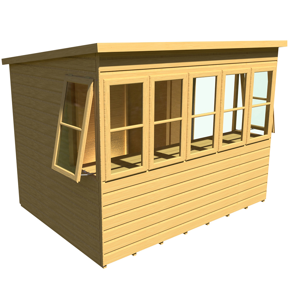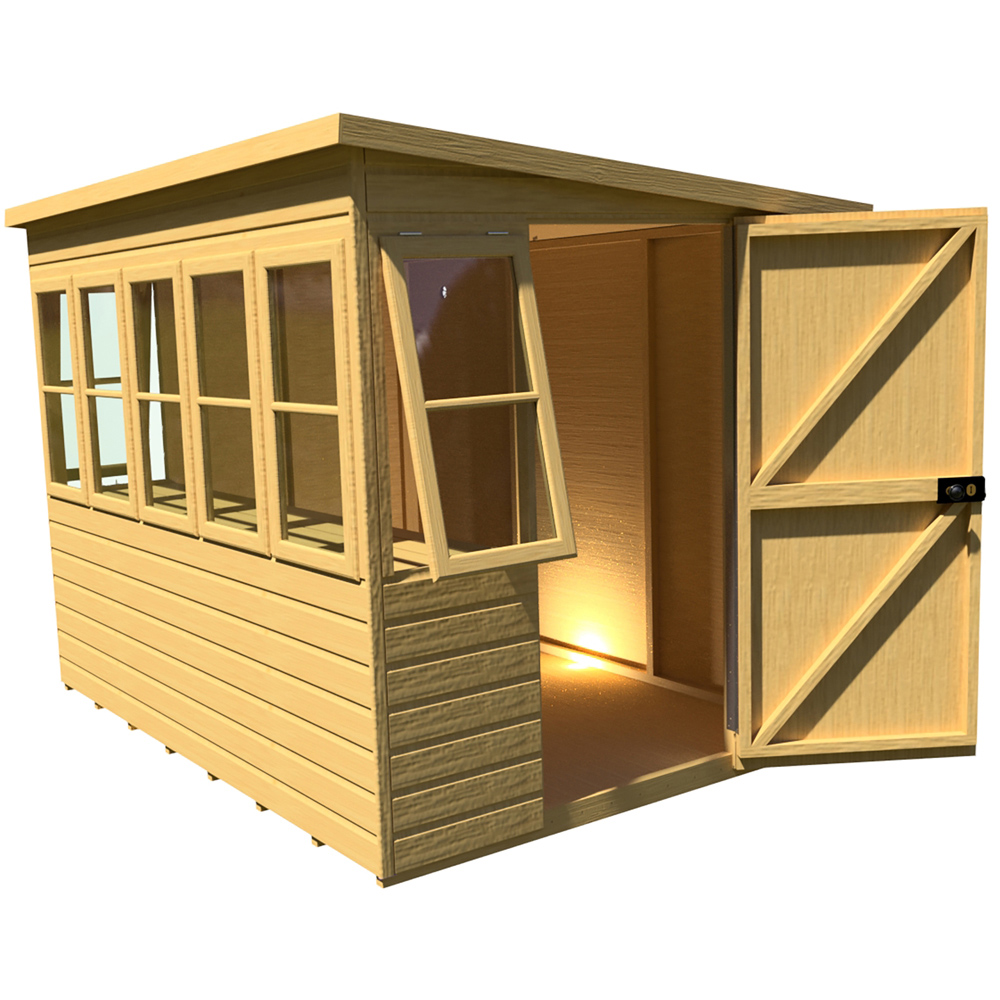 Enhance your garden with the Shire Sun 8 x 6ft Pent Potting Shed, a stylish and practical addition crafted from high-grade FSC-certified pine. This robust shed boasts seven windows – five fixed and two opening, all fitted with horticultural glass to maximise light. Inside, a full-length potting bench provides ample workspace. The 12mm shiplap tongue and groove cladding is complemented by sturdy 34mm square framing for both the floor and roof. A framed door, secured with a rim lock and key, ensures peace of mind. The shed arrives with a honey brown basecoat preservative treatment, ready for your chosen topcoat of paint or stain (as shown in the product image). A mineral roof felt is included. For precise dimensions, please refer to the metric measurements, imperial sizes are approximate. Remember to account for roof overhang and access during construction and subsequent treatment. Following your order, you',ll receive a link to schedule your delivery, and live tracking information on the morning of delivery. Please note: a flat, level base of sufficient size is required for assembly. Grass, soil, or gravel are unsuitable. Assembly instructions and a fixing kit are provided. Currently, delivery is unavailable to the following postcodes: DG, TD, KA, ML, EH, G, PA, FK, KY, PH, DD, AB, IV and KW. We apologise for any inconvenience and will update you when service resumes in these areas.