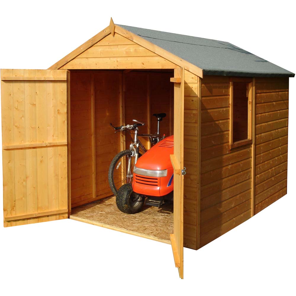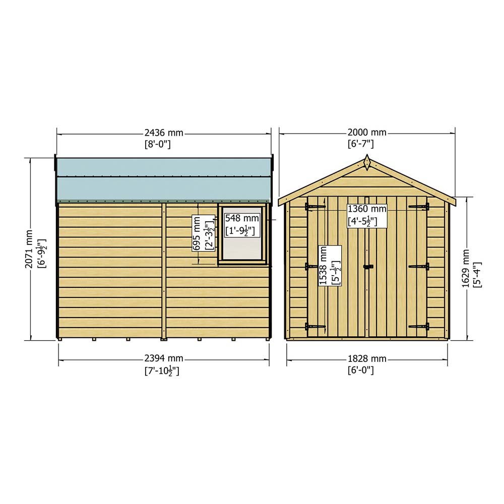 This generously sized 8ft x 6ft Warwick Double Door Wooden Shed is a fantastic investment. Built with high-quality 12mm shiplap timber walls and sturdy OSB roof and floor panels supported by a robust 34mm square frame, this shed offers ample storage. Included are one opening window, roof felt, all necessary fixings, and comprehensive assembly instructions. The shed arrives flat-packed for easy self-assembly. Constructed from FSC-certified High Northern European timber, it boasts a honey brown basecoat preservative treatment, ready for your finishing touch. External dimensions are shown (Imperial measurements are approximate, use metric for precision). Please note that we currently cannot deliver to the following postcodes: DG, TD, KA, ML, EH, G, PA, FK, KY, PH, DD, AB, IV, and KW.