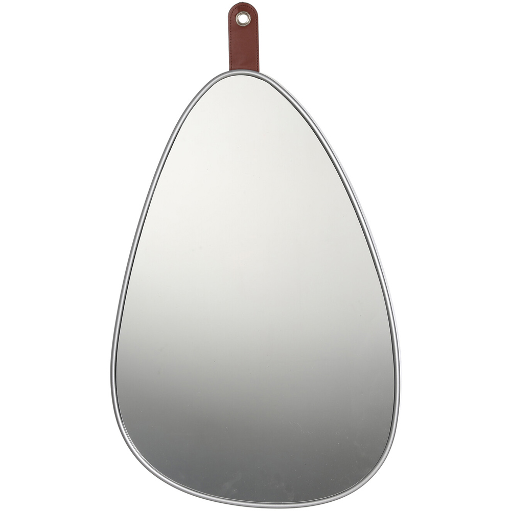 This organic-shaped wall mirror is a stylish statement piece for any modern interior. Its unique egg shape, defined by gently curving lines, offers a contemporary aesthetic. Finished with a hanging tab for easy installation, the sleek silver frame enhances the mirror's reflective surface, creating an illusion of greater space. A perfect blend of form and function, this mirror provides both a convenient way to check your reflection and a sophisticated design element.