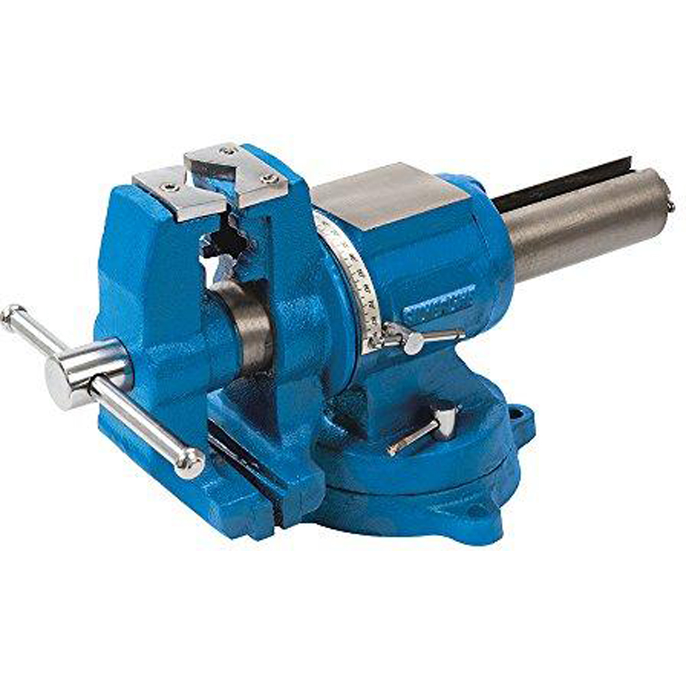 Get the ultimate vice for all your clamping needs. This versatile tool features a rotating 360° vice head with 125mm (5") serrated jaws, ensuring a secure grip on various shapes. With a locking rotating base that includes horizontal and angle graduations, as well as a built-in anvil, it's perfect for precise work. Plus, it boasts robust 3-point pipe jaws for round objects and V-jaws for square items. Crafted from durable graphite iron with a hardened screw thread, and finished with powder-coating and chrome plating for exceptional corrosion resistance, this vice is built to last.