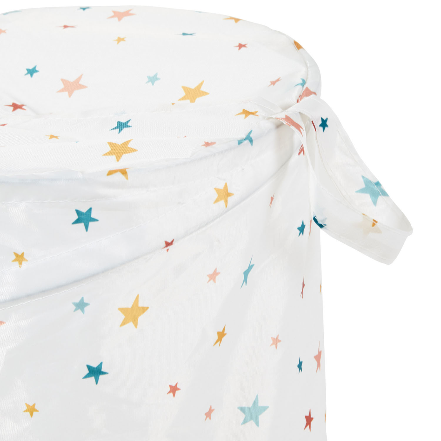 Keep laundry clutter at bay with this fun and practical pop-up laundry hamper. Available in two cheerful designs—fruit or stars—it features a built-in lid to keep clothes neatly contained and out of sight. Its space-saving design folds flat for effortless storage when not in use, making it ideal for kids' rooms or any space needing a playful touch of organization. The vibrant colours and design also make it perfect for storing soft toys.