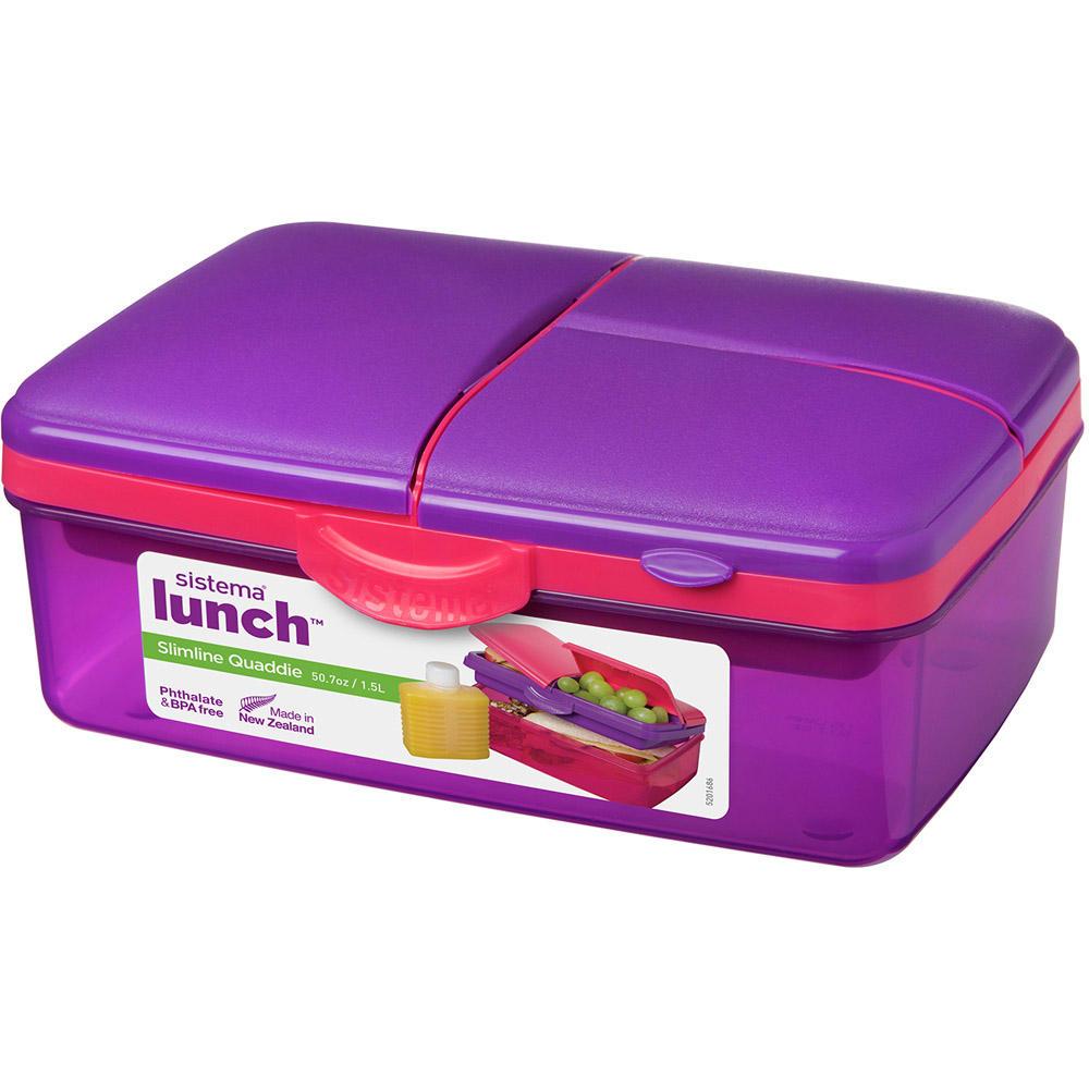 Keep your food fresher for longer with the Slimline Quaddie Sandwich Container from Sistema. This clever container makes transporting food simple, preventing spoilage. Featuring four compartments, it includes a larger section perfect for sandwiches, two smaller sections for snacks, and a dedicated space for a drinks bottle. The lid is equipped with user-friendly clips and an inner seal, ensuring a tight closure to maintain food freshness. Ideal for lunches, snacks, or simply keeping food refrigerated or frozen for future use.