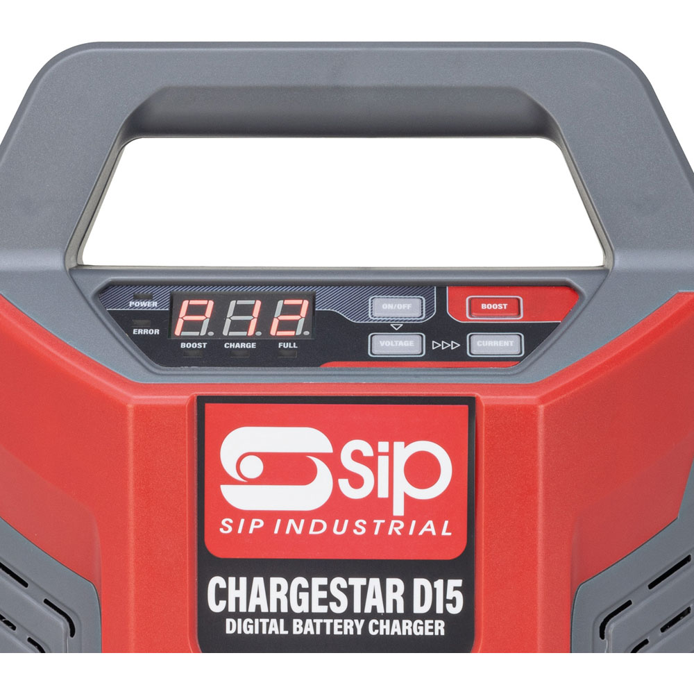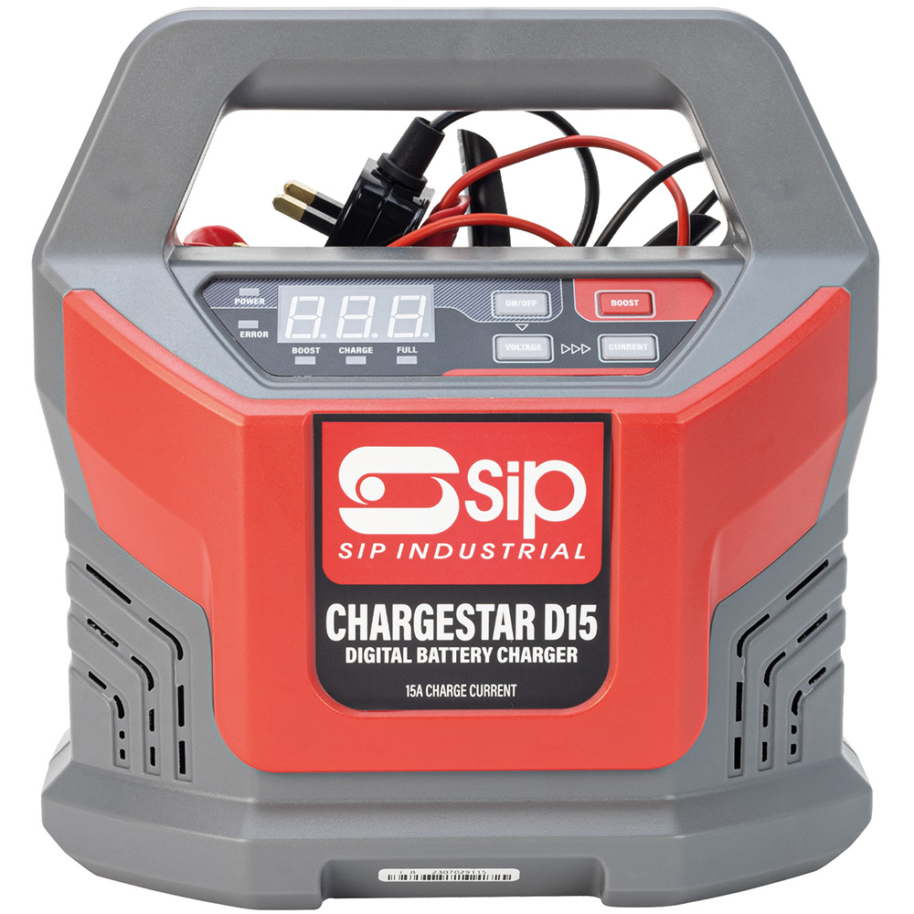 The SIP Chargestar D15: A compact, portable digital charger for all your 12V lead acid battery needs. Its intelligent microprocessor manages a 6-step automatic charging cycle, ensuring faster, safer, and easier charging. Perfect for automotive and workshop use, this versatile charger handles wet, MF, EFB, AGM, and CaCa battery types up to 220Ah (300Ah maintenance). The microprocessor constantly monitors battery health, automatically diagnosing condition and voltage before charging. A full-charge indicator light signals completion, while a low-voltage cutoff (below 3V) prevents attempts to charge unrecoverable batteries. Need a quick boost? Engage the fast charge mode for a 5-minute burst of 15A power. A handy 12V DC socket provides an external 7A power supply. Includes 2 x 1.2m leads with clip clamps. The intuitive soft-touch control panel and LED display make operation simple. Its lightweight design and carry handle allow for easy portability. Safety features include an anti-spark system, reverse polarity and overcharge protection, and an overheating alarm with automatic restart. Backed by a SIP two-year warranty.