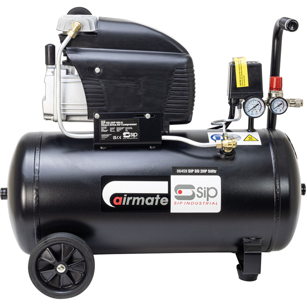 Built for lasting performance, the SIP DD 2hp 50L direct drive compressor is your reliable workhorse for garage, workshop, or mobile use. Its robust design incorporates an efficient cooling system for extended lifespan and a conveniently located external air filter, minimising maintenance. The combination of wheels and a fixed foot provides effortless mobility around your workspace, simplifying transport and storage. Powering this dependable unit is a brushless 2hp (1.5kW) motor, ensuring consistent performance and longevity. Direct drive transmission guarantees reliable operation day in, day out. The compact 50L air receiver offers ample capacity without sacrificing space. Precise pressure control is achieved via an adjustable regulator and gauge, ensuring optimal performance for every task. Complete with a SIP two-year standard silver warranty.
