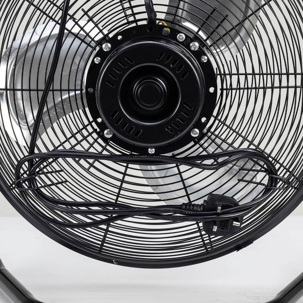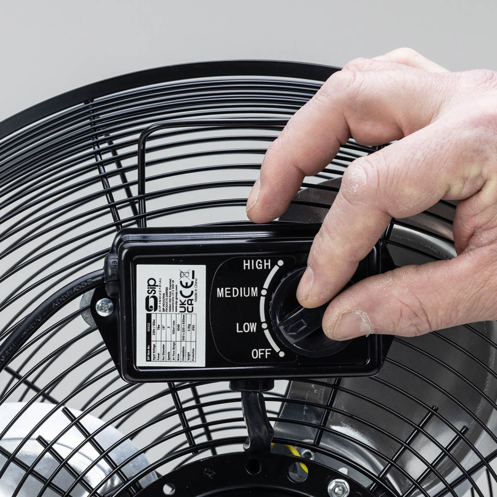 Keep cool with the SIP 16-inch heavy-duty floor fan. Its three-blade design delivers powerful airflow, ideal for circulating air and cooling various indoor spaces. The robust steel frame provides stability, while the tilting fan head lets you precisely direct the airflow. Enjoy three variable speed settings: 955rpm (low), 1111rpm (medium), and 1302rpm (high), all powered by a 75w motor. Safety is paramount; the blades are fully enclosed by a solid steel mesh guard. This fan comes with a two-year warranty for your peace of mind. Perfect for offices, workshops, or home use.