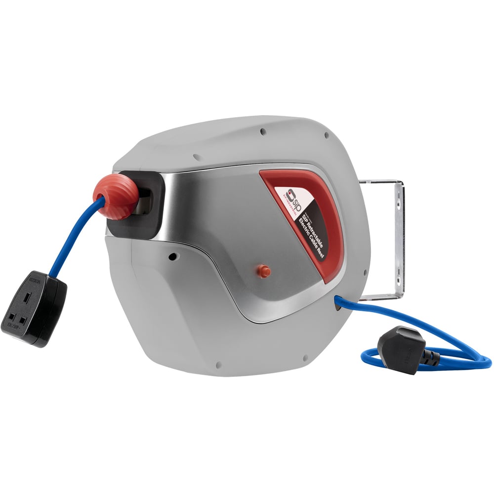 This SIP electric cable reel provides a convenient and safe power solution for workshops and garages. Its 15-metre retractable cable, housed in durable polypropylene, offers a 13A supply (2400W unwound, 1100W wound) for your workspace. The integrated recoil system ensures smooth, tangle-free retraction, keeping your area tidy. A 180° swivel bracket on the robust casing allows for flexible positioning, whether wall or ceiling mounted. Safety features include a thermal trip switch to prevent overload and a high-visibility blue cable to minimise trip hazards. The unit boasts a UK 13A plug and socket, and is covered by a SIP two-year warranty.