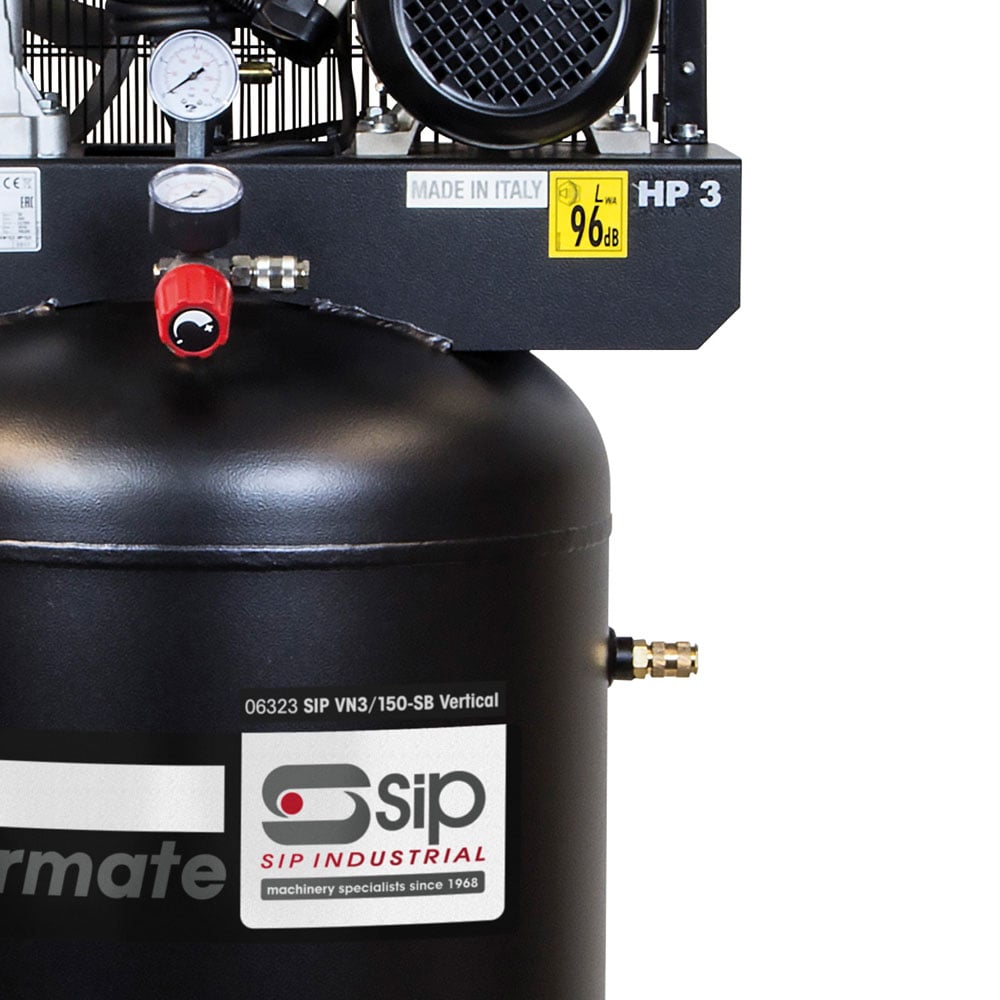 The SIP VN3/150-SB: A powerful 150-litre vertical compressor, perfect for space-conscious environments. Its vertical design minimises footprint without sacrificing performance or durability. Built with heavy-duty components for lasting reliability, it delivers high-quality, dry air thanks to features like finned manifolds, an oversized crankcase, and an aluminium aftercooler – reducing weight and corrosion. Ideal for workshops, industrial, and light commercial use. This oil-lubricated, belt-driven compressor boasts a heavy-duty pump for superior performance, a robust cast iron barrel for extended service life, and superior moisture reduction. Backed by a SIP two-year standard silver warranty and proudly made in Italy.