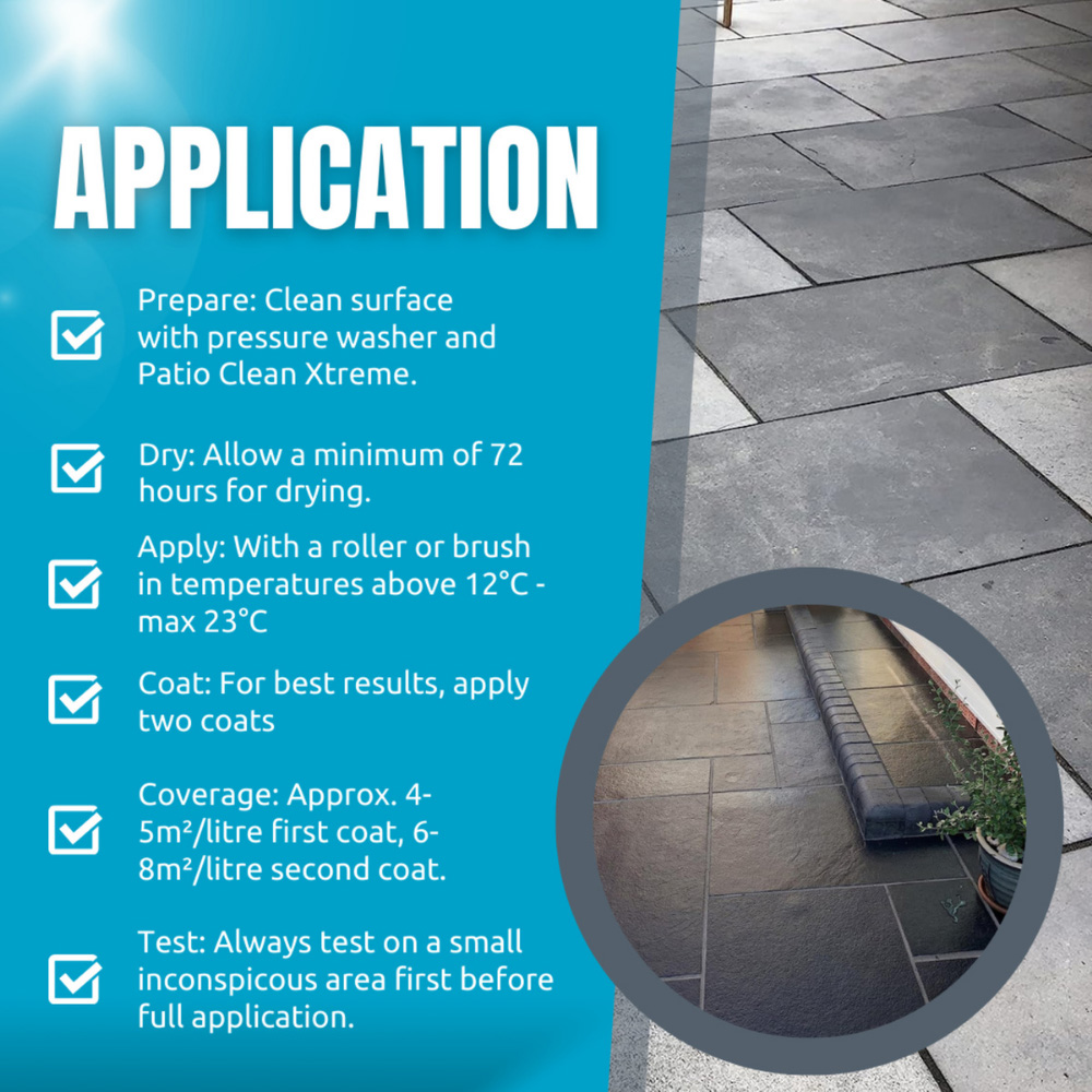Before you begin, pressure wash your limestone or slate surface and let it dry completely for at least 72 hours. Apply two coats with a roller in temperatures between 12°C and 23°C. This pack contains two 1L containers.