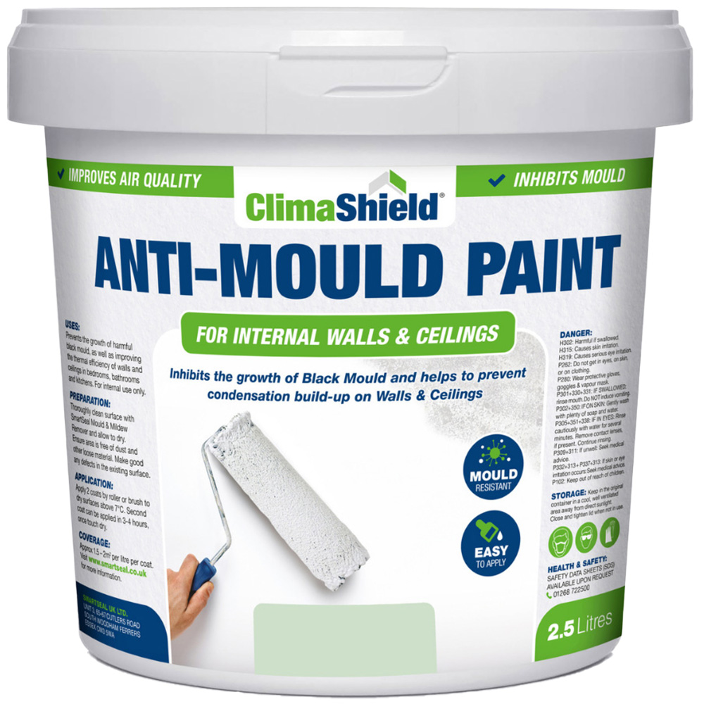 Elevate your home's interior with SmartSeal's 2.5L Anti-Mould Paint. This sophisticated green paint delivers a matte finish and is expertly formulated to prevent the growth of harmful mould, mildew, and algae. Its active fungicide inhibits mould and mildew germination, safeguarding your family's health, especially those with respiratory sensitivities. The solvent-free, low-VOC formulation contributes to improved indoor air quality. This versatile paint functions as an effective mould-resistant coating for walls, ceilings, and floors in bedrooms, bathrooms, kitchens, and basements.