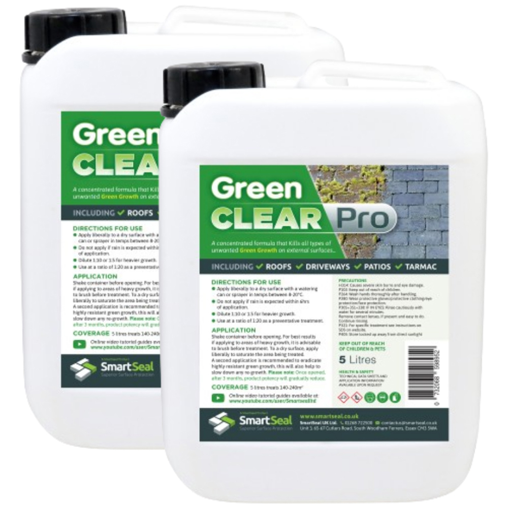 Banish unsightly green growth with SmartSeal Green Clear Pro Lichen and Algae Killer. This microbiological biocide swiftly eliminates algae, mold, lichen, and other organic matter from exterior hard surfaces like driveways, patios, roofs, walls, and paths. Easy to use, simply apply with a watering can or sprayer—no harsh scrubbing or pressure washing required. For heavy infestations, dilute 1:5 with water; for regular maintenance, use a 1:10 dilution. One 5L bottle covers 100–125m², and this pack contains two 5L bottles for extended protection and prevents regrowth.