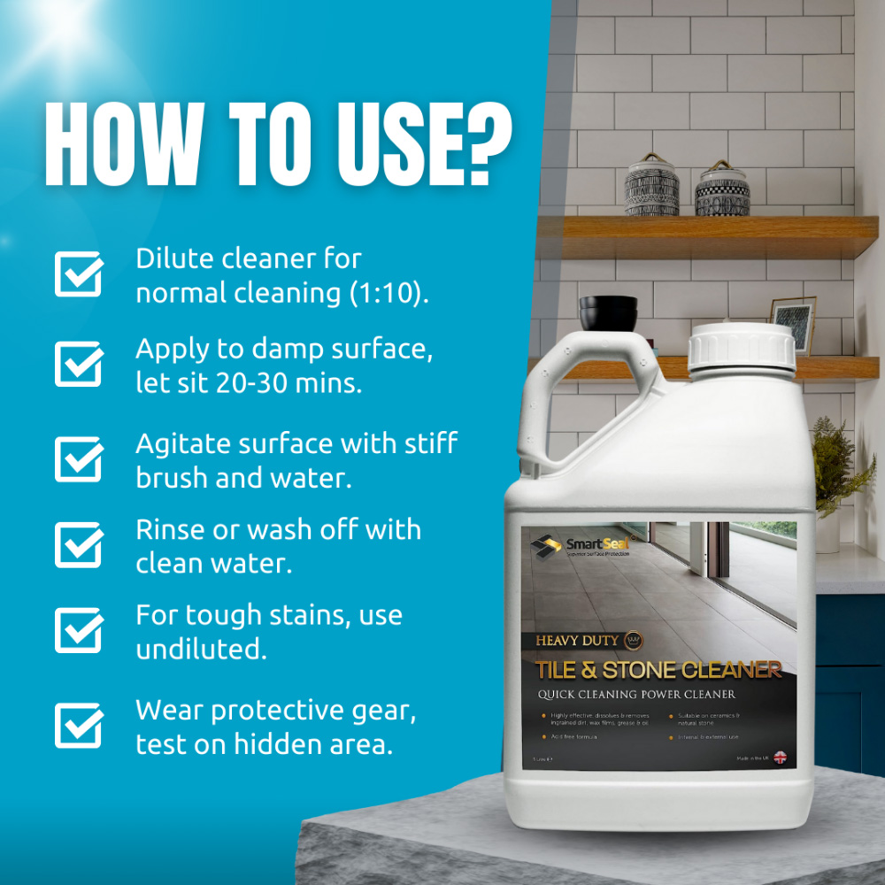 Unleash the brilliance of your tile and stone surfaces with SmartSeal Heavy Duty Tile and Stone Cleaner. This professional-grade formula powerfully tackles dirt and grime on ceramic, porcelain, slate, granite, marble, terracotta, and limestone. Effectively removes even the most stubborn contamination from polished marble and other natural stone. For optimal results, follow cleaning with a solvent-based stone impregnator (sold separately). This concentrated cleaner is supplied in a 1L bottle.